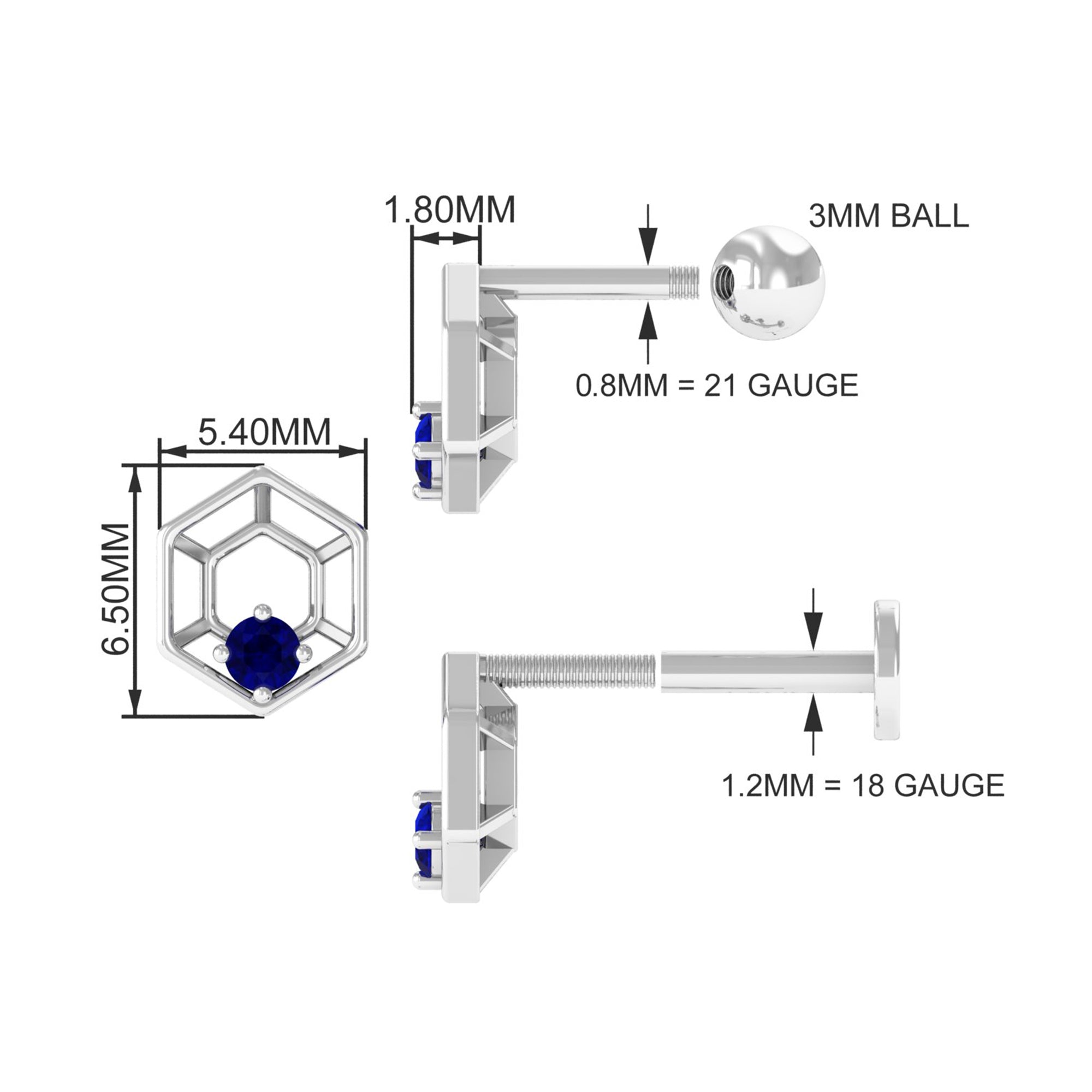 Real Blue Sapphire Geometric Earring for Conch Piercing ‐ AAA / 18K White Gold / Flat Back 6.0 MM