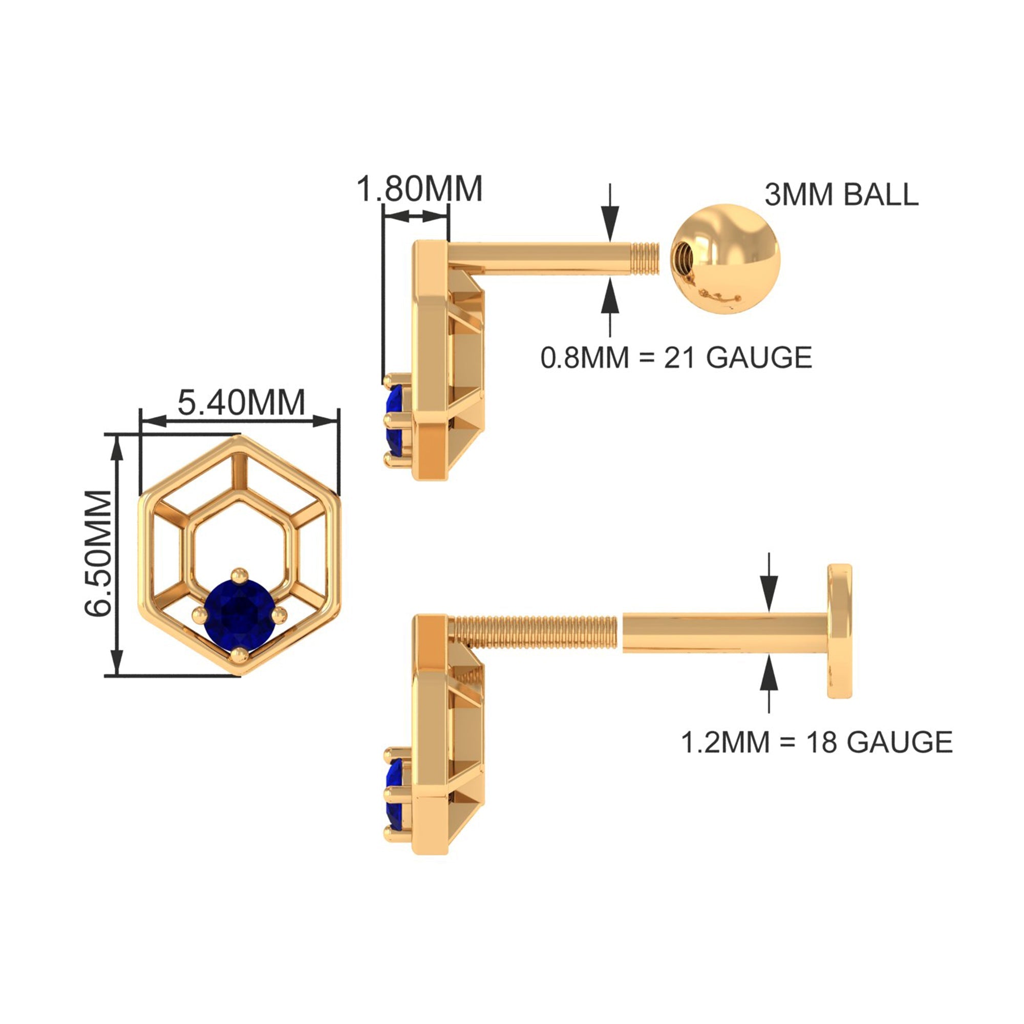 Real Blue Sapphire Geometric Earring for Conch Piercing ‐ AAA / 18K Yellow Gold / Flat Back 6.0 MM