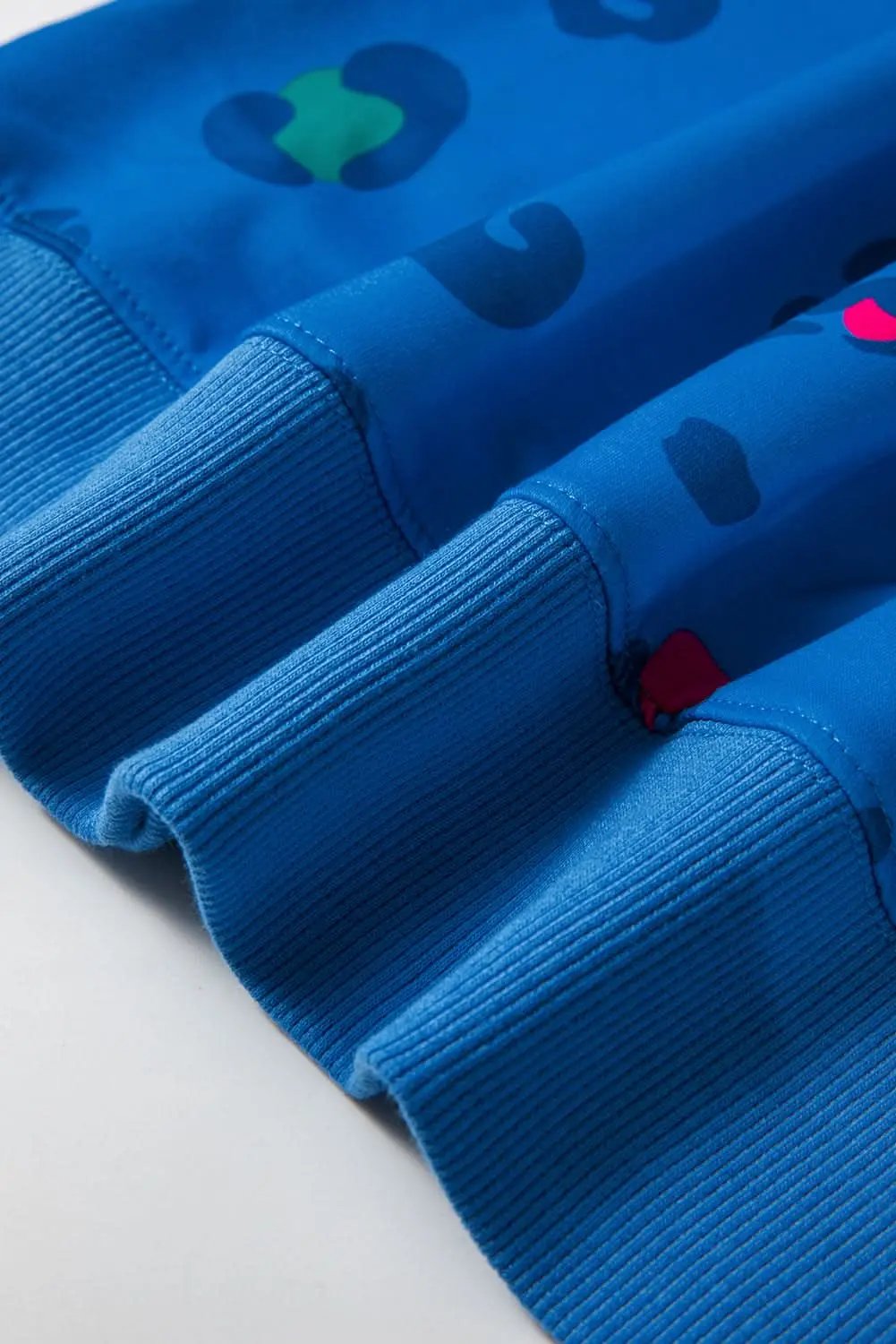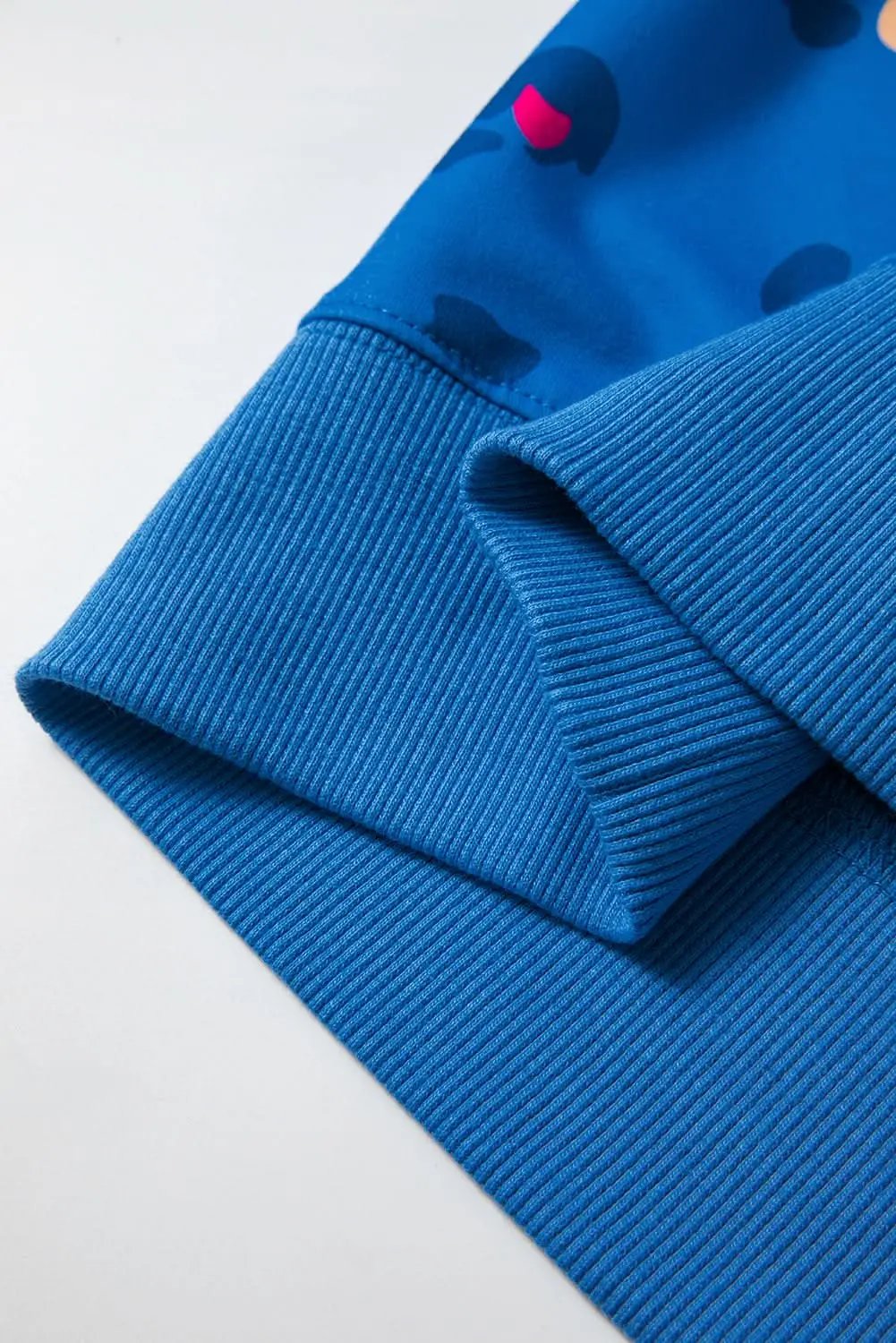 The bold leopard pattern sits on a sky-blue base for a modern look, while the drop shoulder design creates a relaxed silhouette that flatters a range of body types. Ribbed edges at the hem and cuffs help maintain shape through daily use and layering.