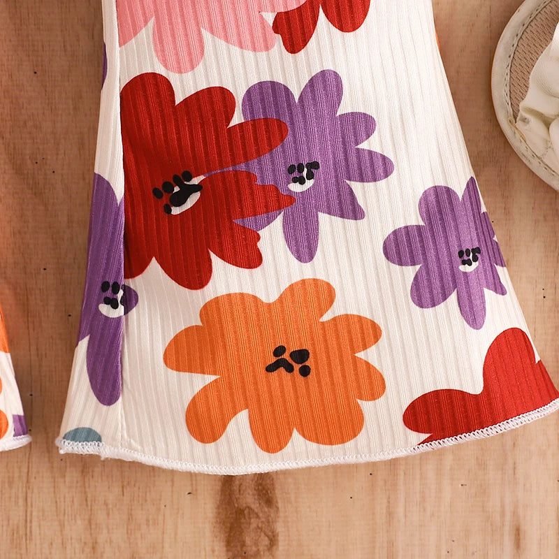 Baby Toddler Kids Girls 2Pcs Summer Sleeveless Tank Top Ruched Floral Flower Print Camisole Flared Matching Long Pants Set Outfit ‐ Purple, Green, Red & Orange Flowers / 2-3T / United States