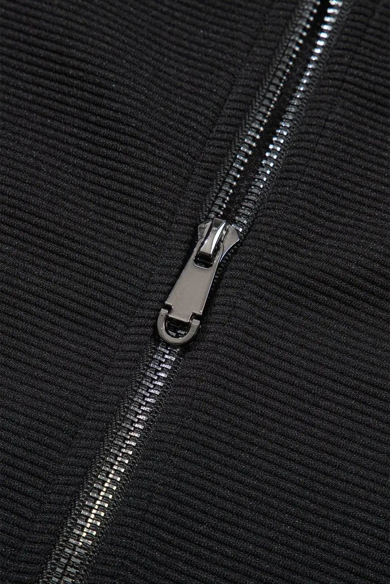 Key features: textured ruffled sleeves, zipped neck, high-waist pants, pockets, soft stretch fabric, solid black color.