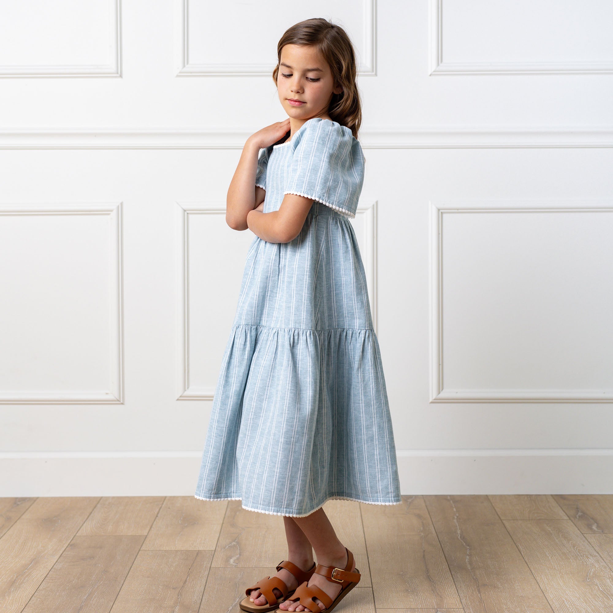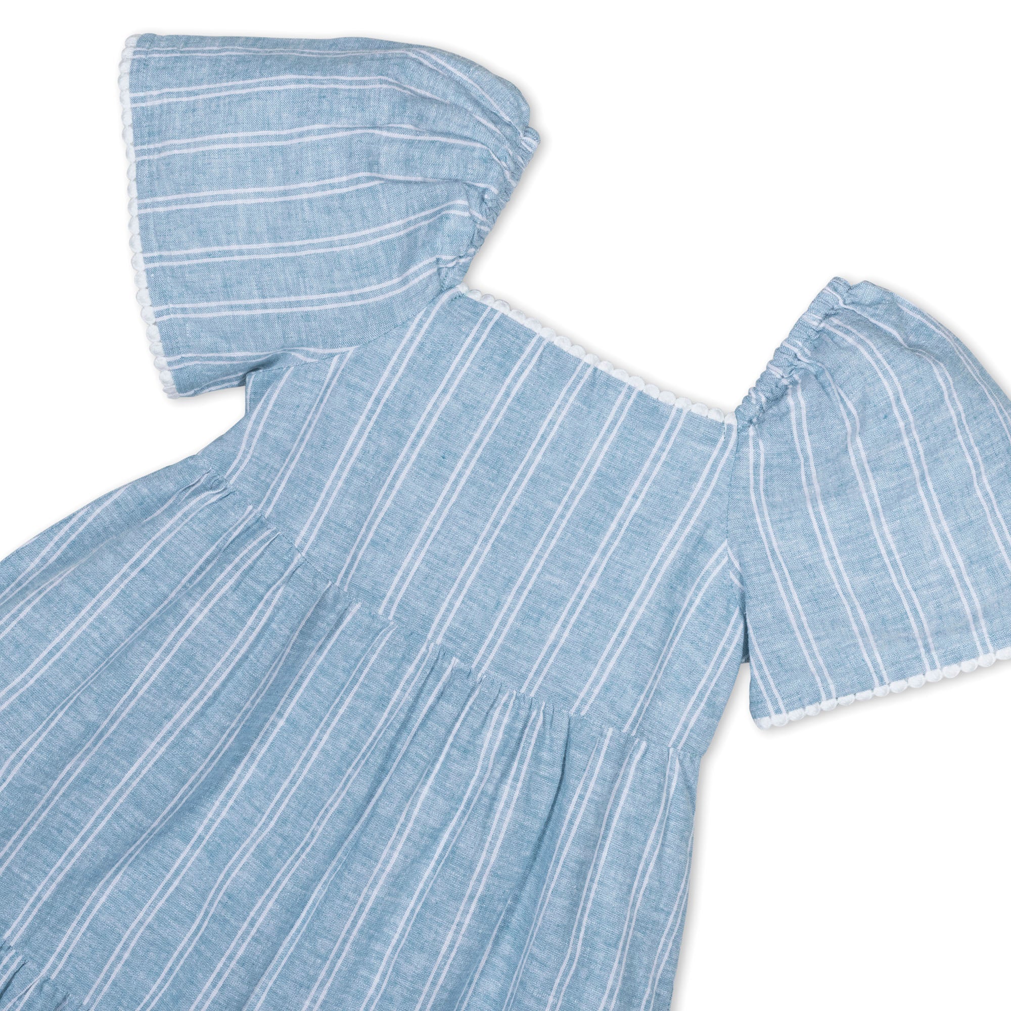 Crafted from our soft linen and organic cotton blend, our flounce sleeve dress is what what we picture your girl spending their summer in. Flouncy sleeves, crochet trim, and a flowing tiered body give this breezy dress a fun summer vibe. Fully lined in organic cotton with a zipper closure at the center back for easy dressing.
