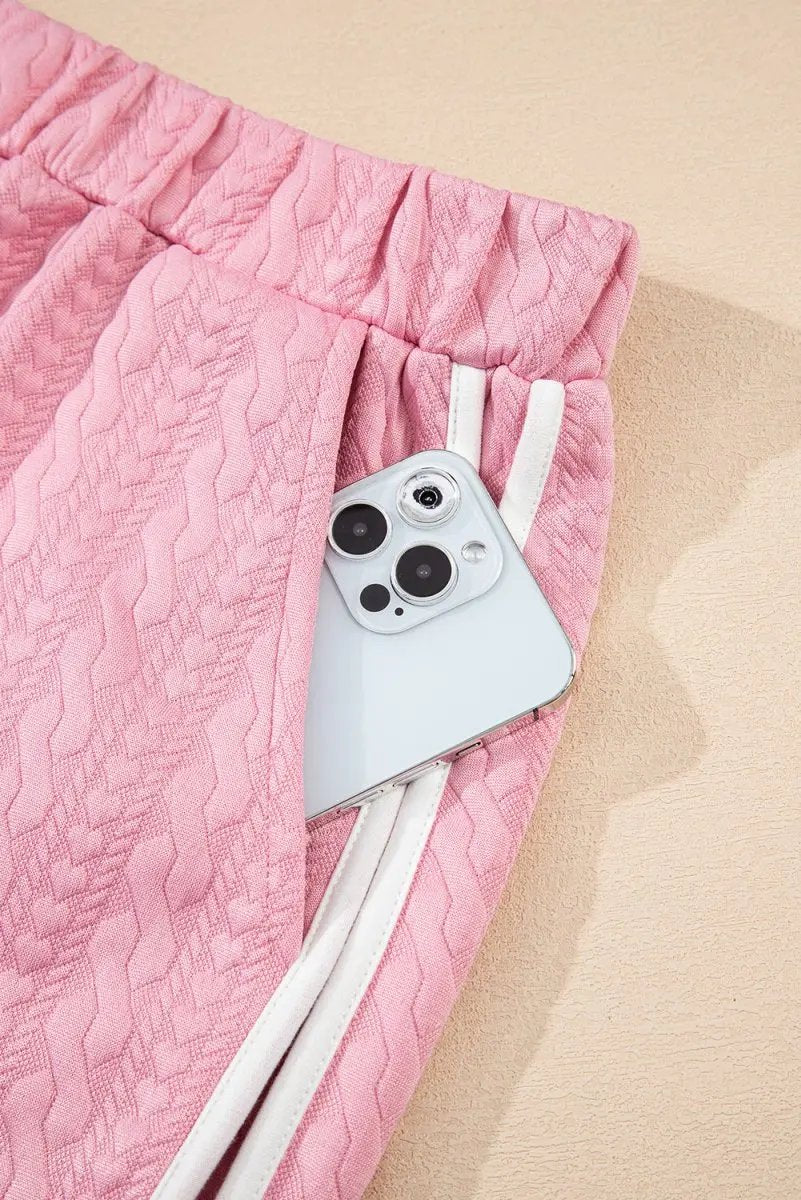 Pink Contrast Trim Textured Crewneck Tee And Pocketed Skirt Set