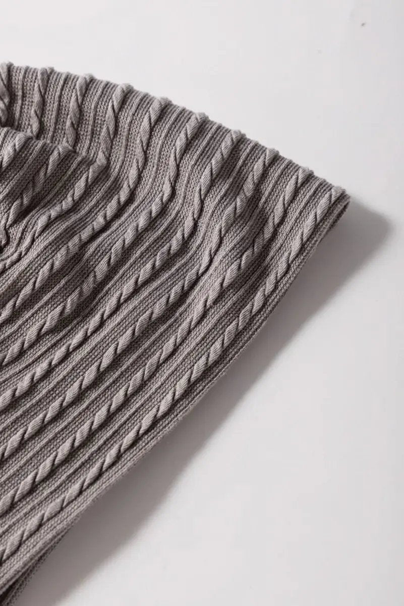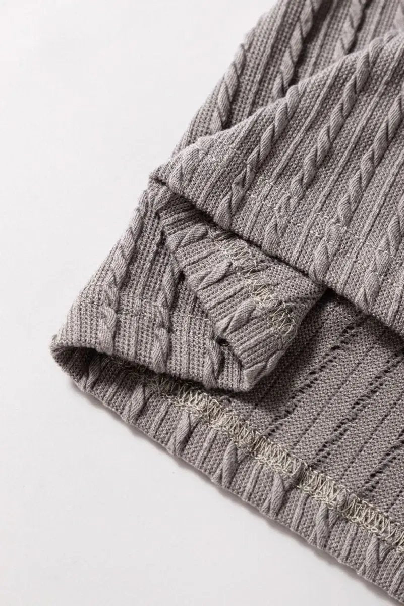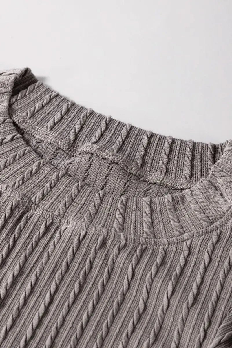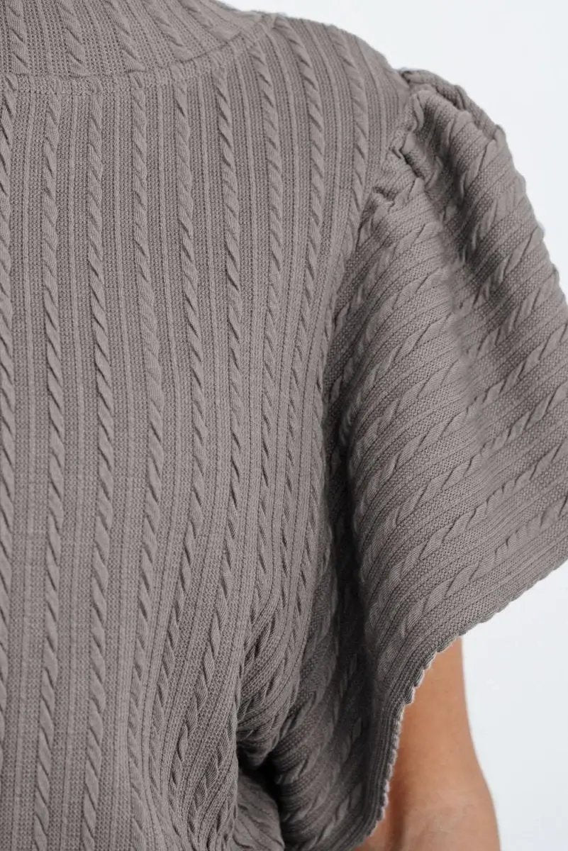 Key details include delicate flutter sleeves and shirring accents that create a flattering drape. The solid sleet color provides versatile styling, making it suitable for casual outings or weekend gatherings. The mid-weight knit holds its shape while remaining breathable throughout the day.