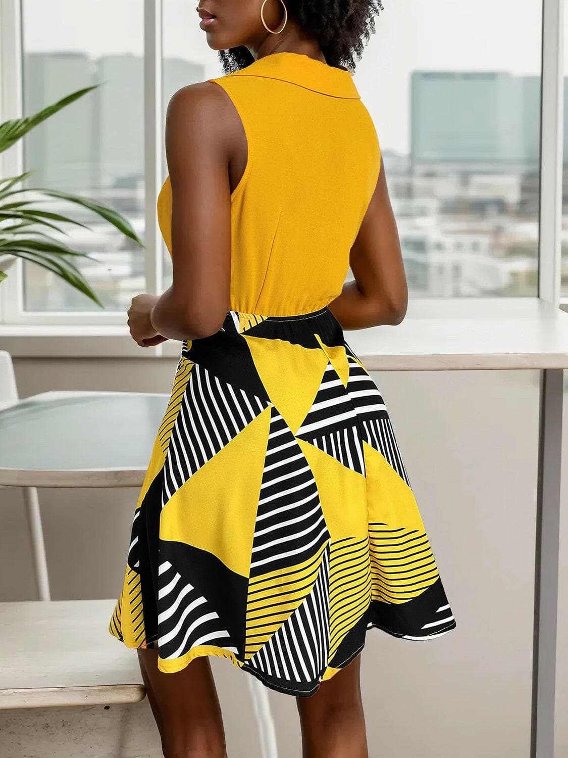 Elevate your wardrobe with a versatile piece that blends sophistication and comfort. This dress is crafted from 100% polyester, offering durability and a lightweight feel. A collared, sleeveless bodice leads to a belted waist and a structured silhouette that flatters the figure. The skirt features a bold geometric print in yellow with black and white accents, providing a modern focal point aligned with contemporary trends. The fabric is opaque and unlined, delivering a refined, breathable look. This dress transitions seamlessly from day to night with minimal styling, whether paired with heels for a formal setting or flats for a casual outing. It pairs well with sandals, pumps, or ankle boots for versatile styling.
