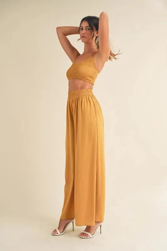 MABLE Smocked Bralette Crop Top and Wide Leg Pants Set ‐ Gold Mustard / L