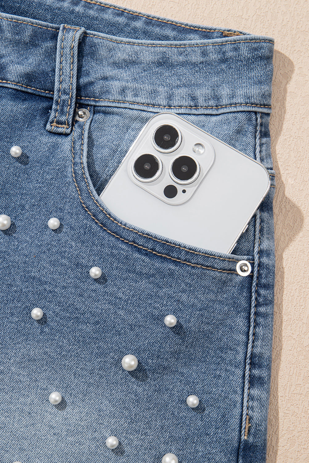 Amelie Pearl Beaded Raw Hem Medium Wash Denim Shorts