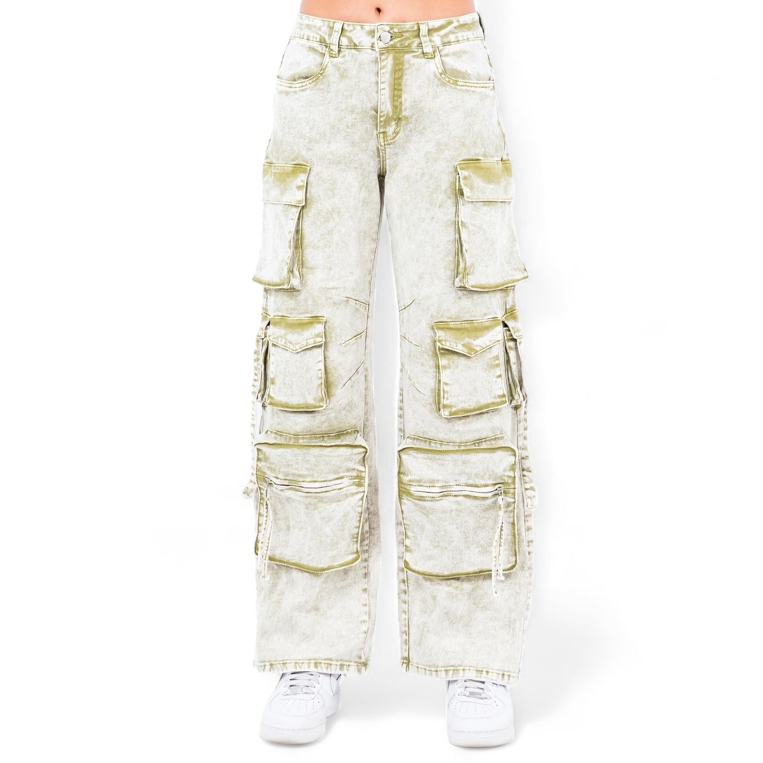 Multiple Pocket Acid Wash Denim Pants- RJH30665 ‐ Green / Medium