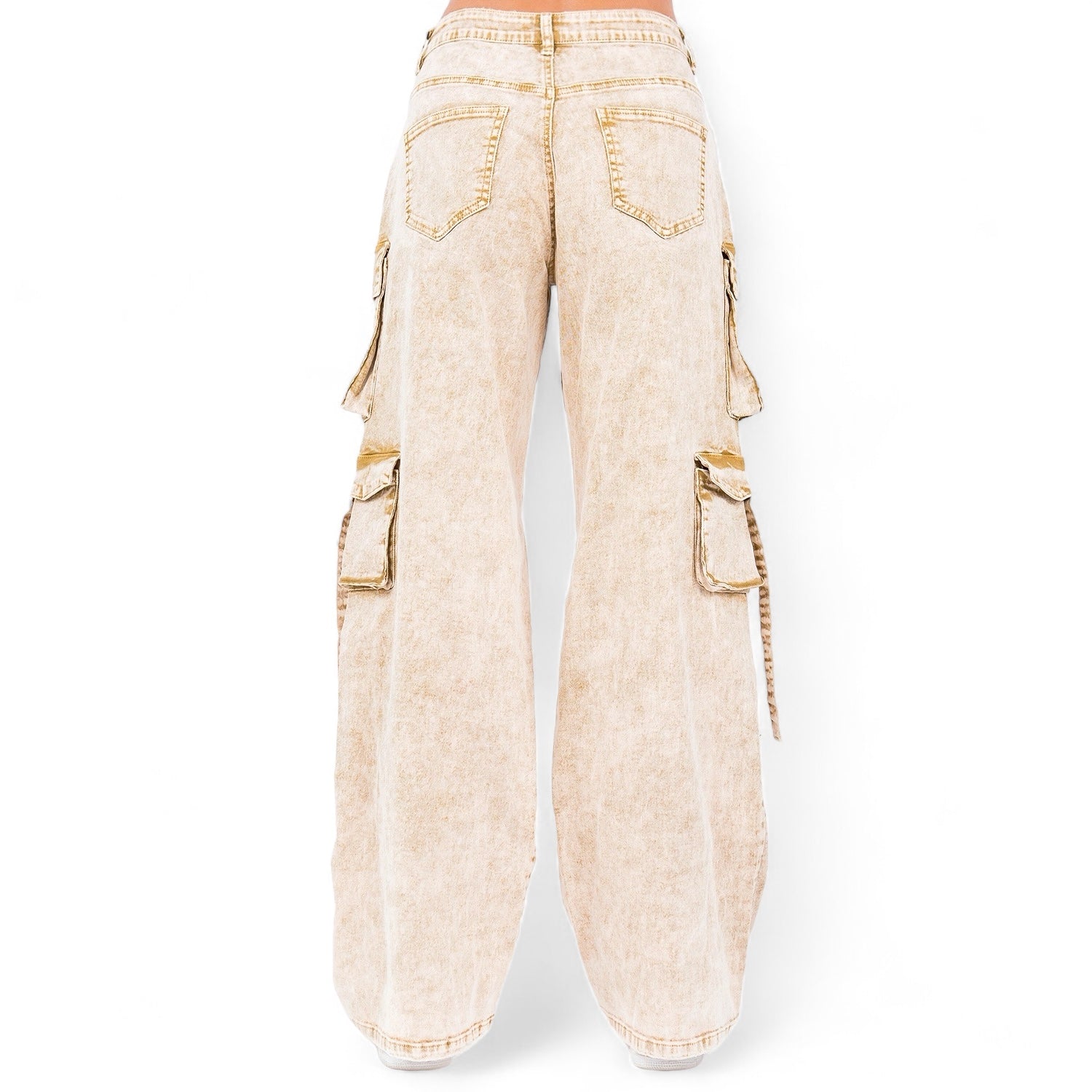 Multiple Pocket Acid Wash Denim Pants- RJH30665 ‐ Beige / Small
