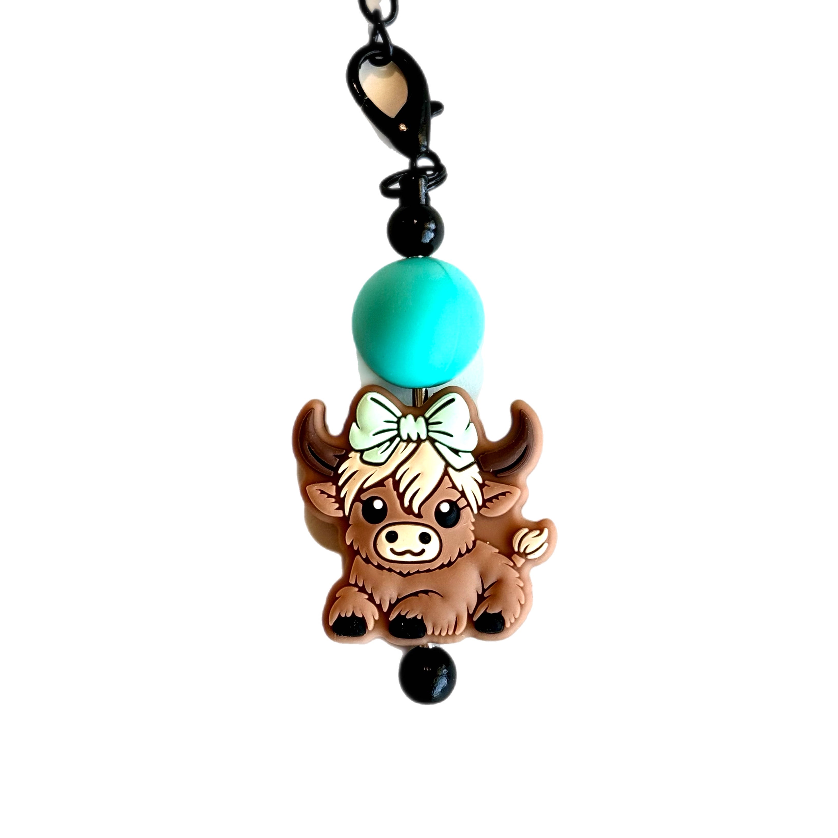 CUTIE HIGHLAND COW Charm - Tumbler Handle Charm ‐ Teal Bow