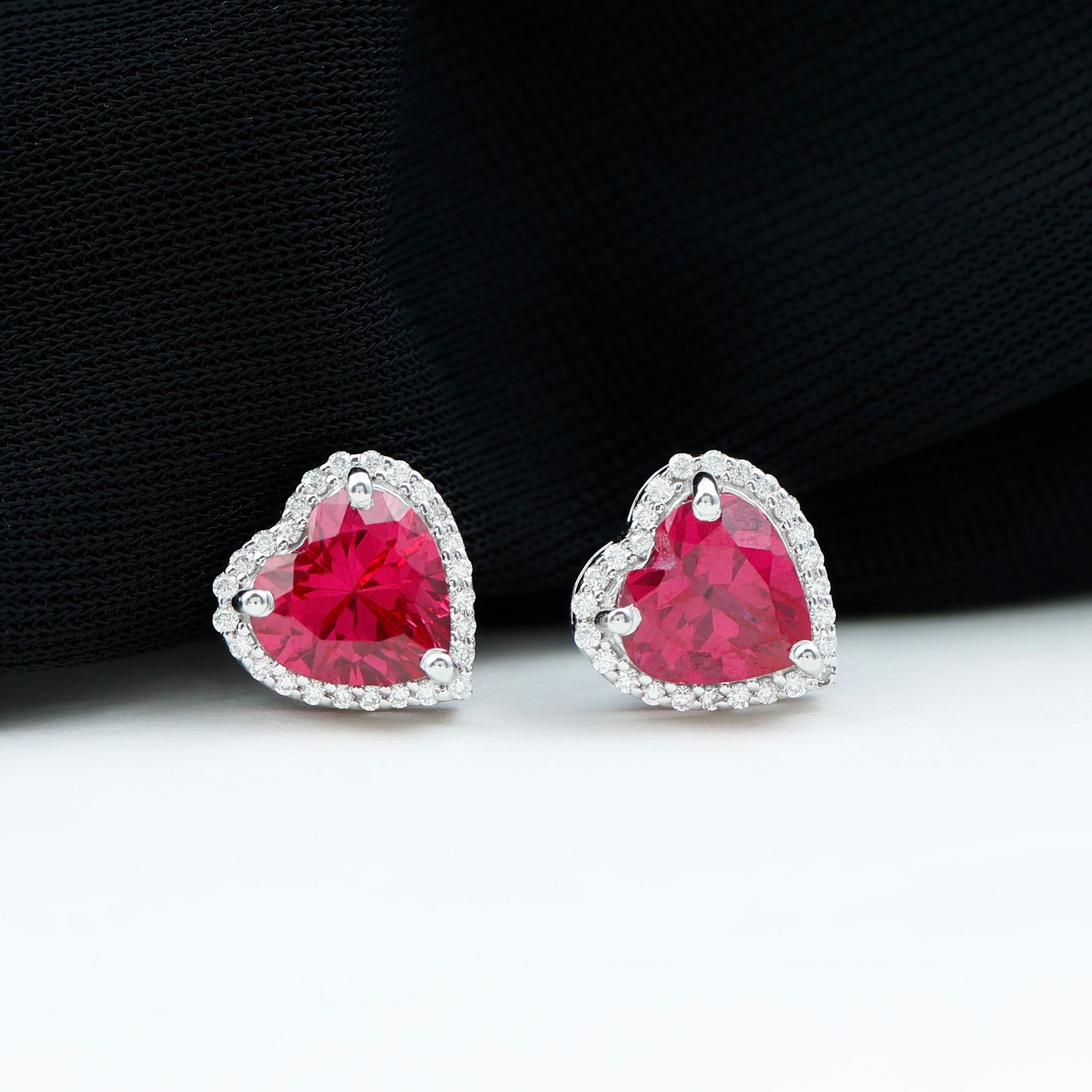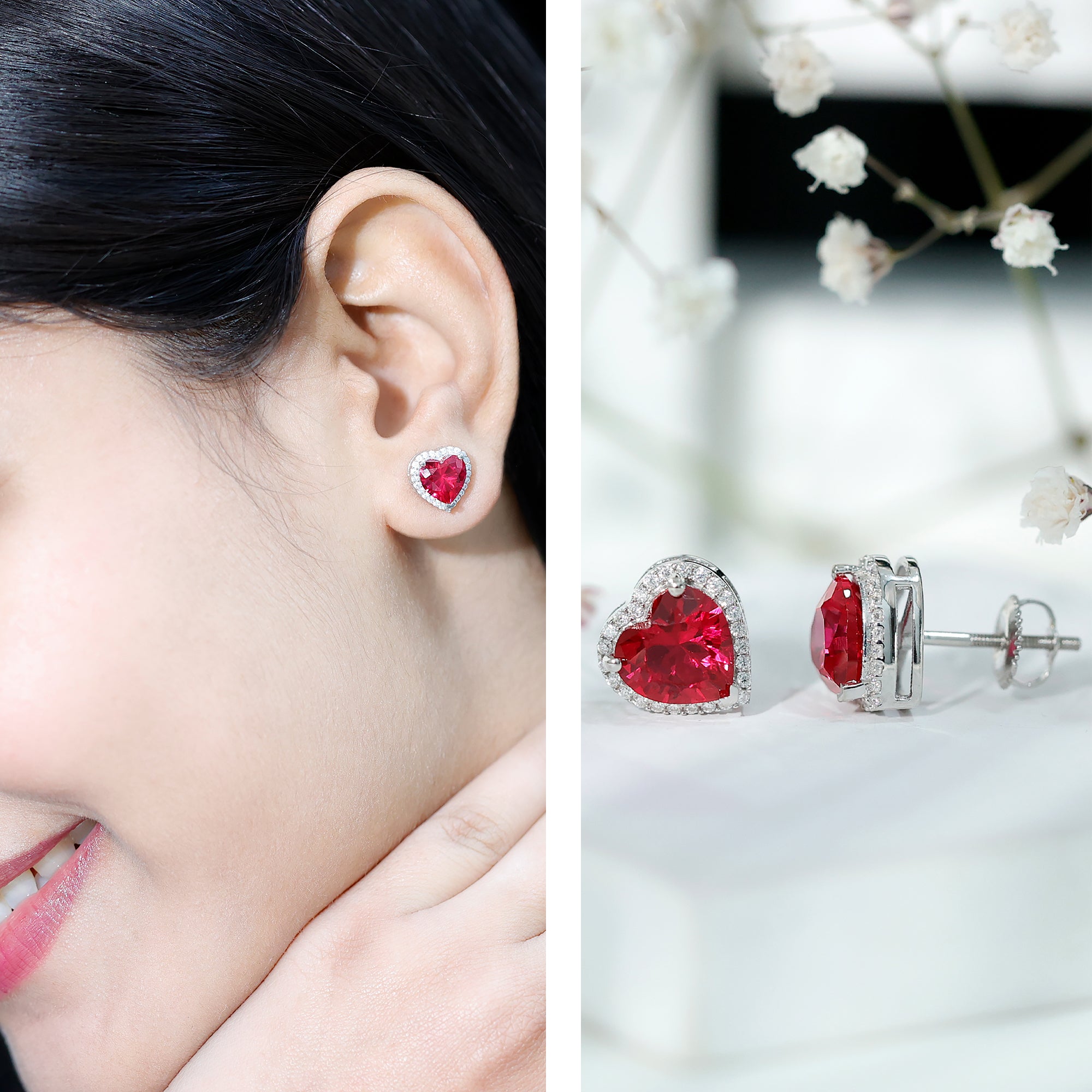 Shine brighter than ever when you wear our Lab Grown Ruby Stud Earrings. These Classic Halo Earrings feature a striking 8 MM heart shaped lab grown ruby surrounded by a halo of round cut moissanite stones. A prong setting holds the center stone in place while the screw back closure ensures a comfortable and secure fit all day long. Additionally, they are handcrafted in 14K White Gold Plated Silver, ideal for everyday wear or special occasions. For the one in your life who loves glamour, this pair makes the perfect gift for birthdays, anniversaries, Christmas Day, Valentines Day, Mothers Day, New Year, or Halloween.