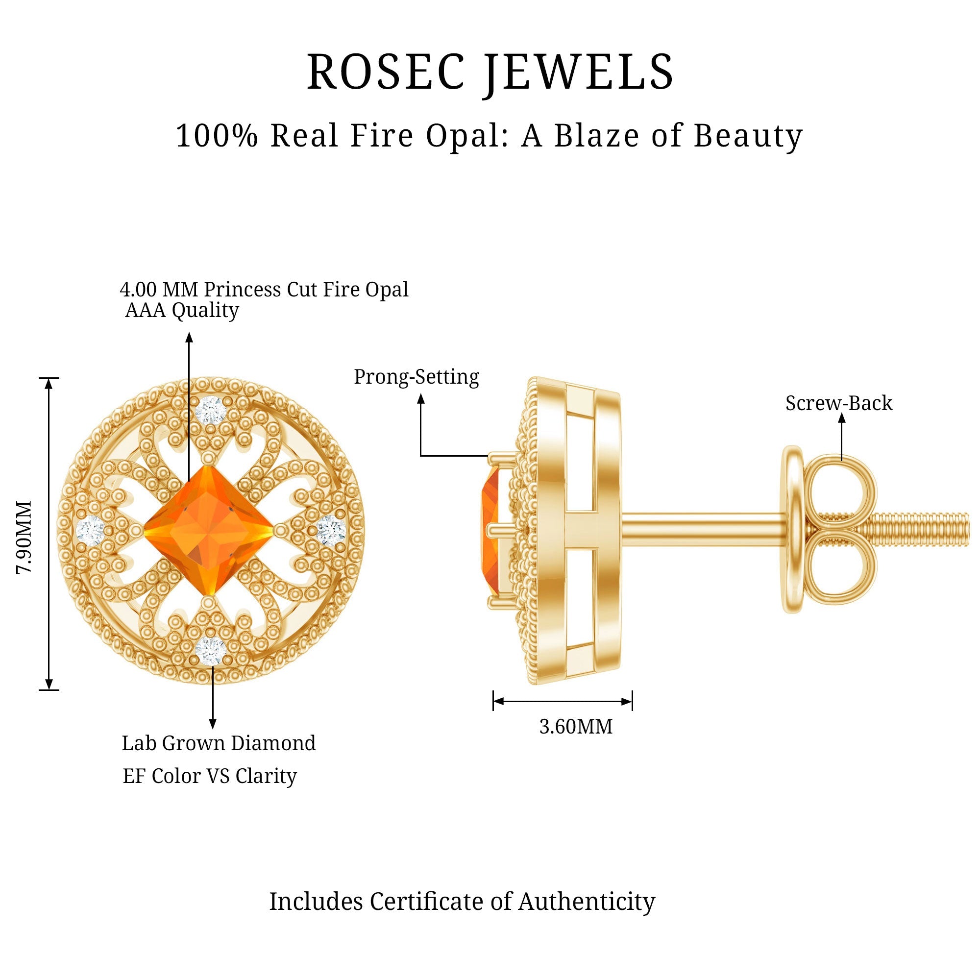 Inspired by the charm of old-world elegance, these Fire Opal Stud Earrings shine with warmth and timeless grace. Made with care in 14K yellow gold plated silver, these Round Stud Earrings feature a bright princess cut fire opal at the center. Surrounding the center stone is a beautiful, antique style design with delicate swirls and tiny bead details. The pattern feels classic and elegant, inspired by antique jewelry. Small round lab created diamonds are set in between, adding just the right sparkle and shine. They bring a soft contrast that highlights the deep color of the fire opal even more. These October Birthstone Earrings have screw backs, so they stay securely in place while being comfortable to wear all day. Whether you are getting dressed up for a special event or just want to brighten up your everyday outfit, these Vintage Opal Earrings are a lovely choice. Fire opal is known to represent passion and creativity, while the lab-created diamonds add a touch of purity and brilliance. Together, they create a meaningful piece you will enjoy wearing again and again. These Opal and Diamond Earrings are perfect if you love vintage-style jewelry with a modern twist. Whether it’s a gift for someone special or a treat for yourself, this pair brings warmth, style, and timeless beauty in one elegant design.