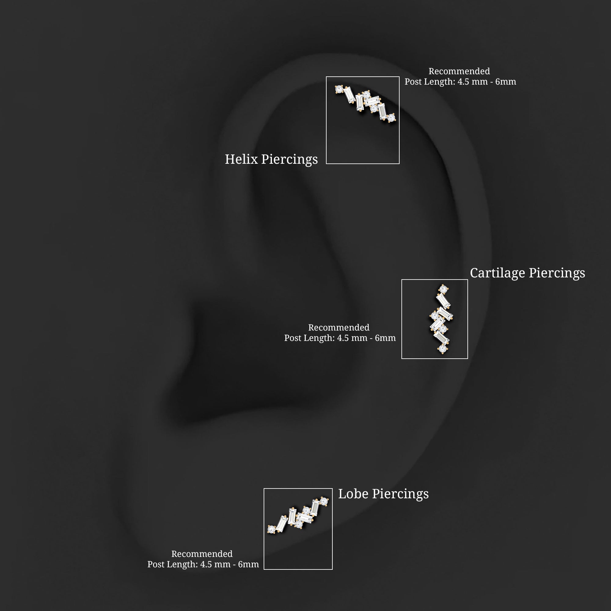 Baguette and Round Moissanite Cartilage Earring in Gold ‐ D-VS1 / 18K White Gold / Flat Back 5.0 MM