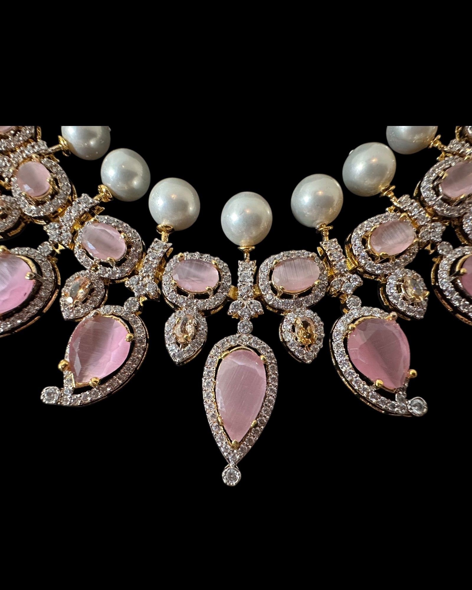 BR462 Anmol necklace set in pink( rose quartz ), Cats eye and pearls ( SHIPS IN 4 WEEKS )