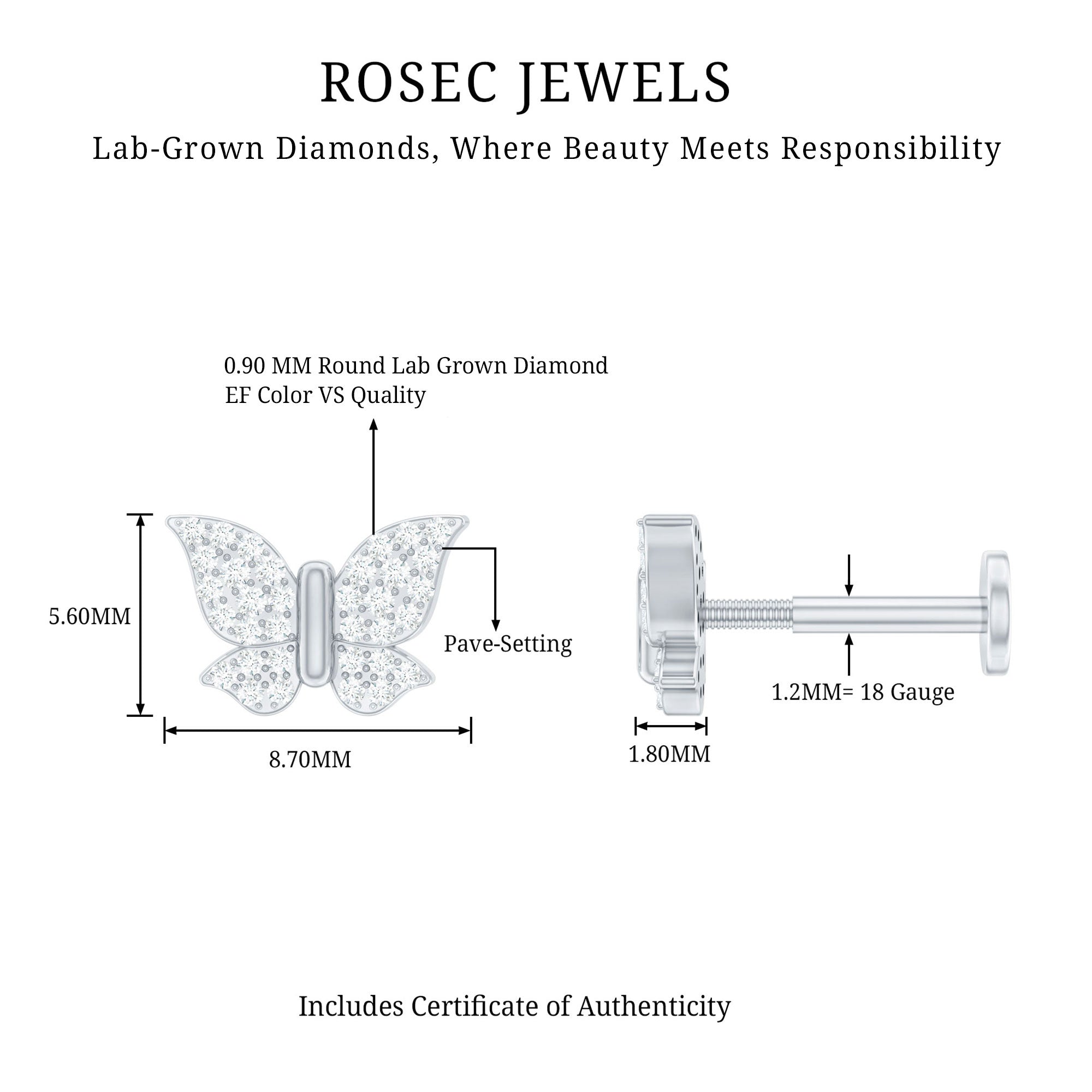 Certified Diamond Butterfly Cartilage Earring ‐ Lab - ( EF-VS ) / 18K White Gold / Flat Back 5.0 MM