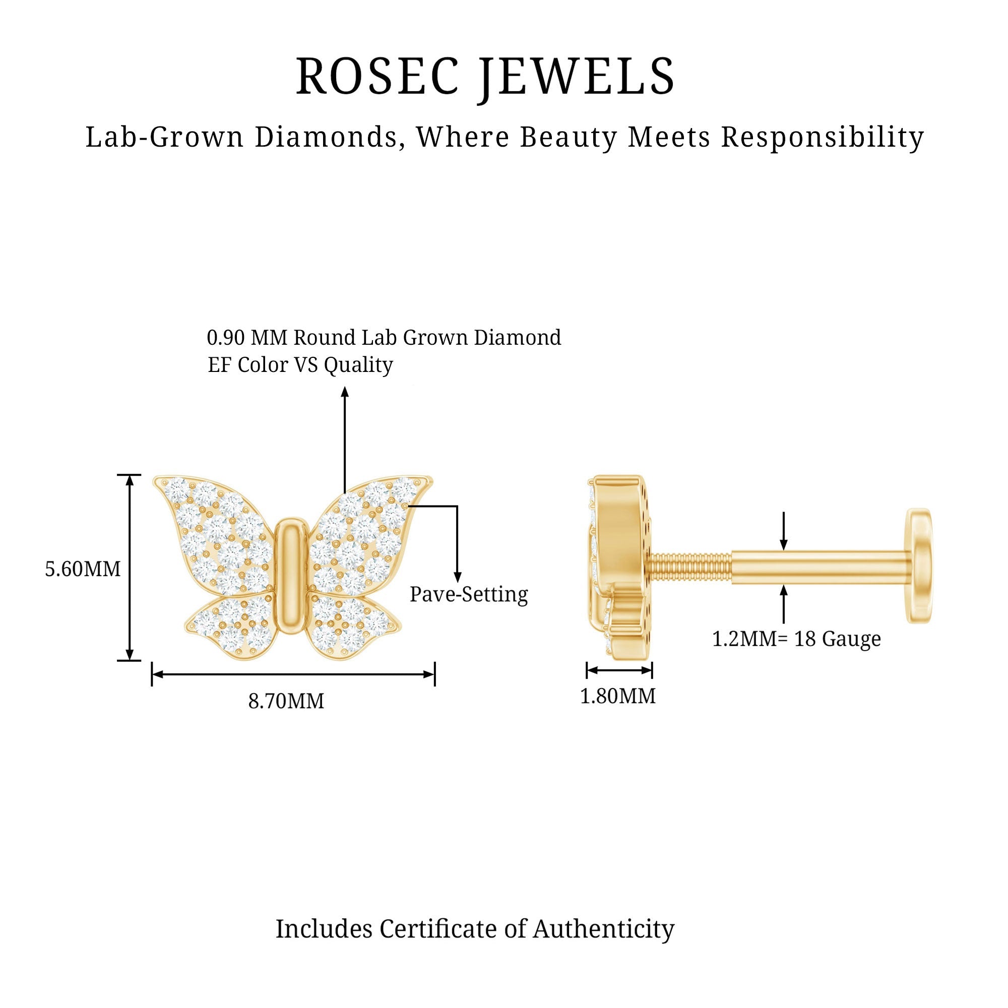 Certified Diamond Butterfly Cartilage Earring ‐ Lab - ( EF-VS ) / 18K Yellow Gold / Flat Back 5.0 MM