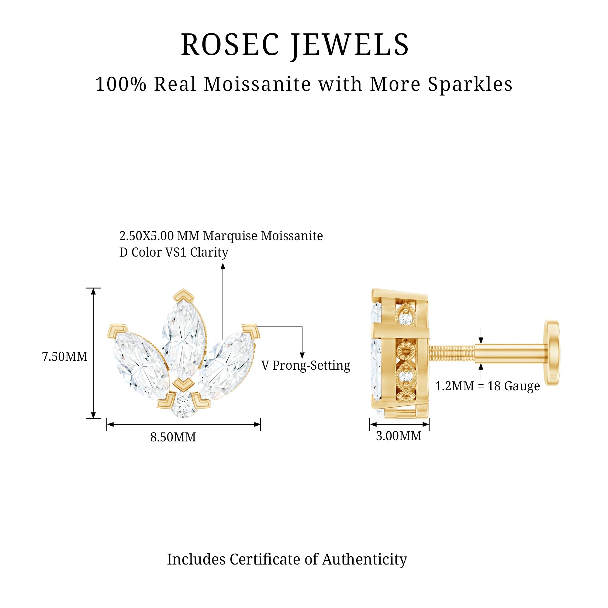 This Moissanite Cartilage Earring is handcrafted with Marquise and Round shape Moissanite placed delicately in V Prong Setting. This Helix Earring can be styled on Tragus and Lobe Piercing. This Earring can be paired with other small earrings in Lobe Piercing to achieve a signature look. Grab this Piercing Earring and level up your style quotient with the classic shine of D-VS1 quality Moissanite embedded in this leaf stud. This Earrings with Flat Back will be delivered to you in a classic jewelry box with a certificate of gemstone authenticity.