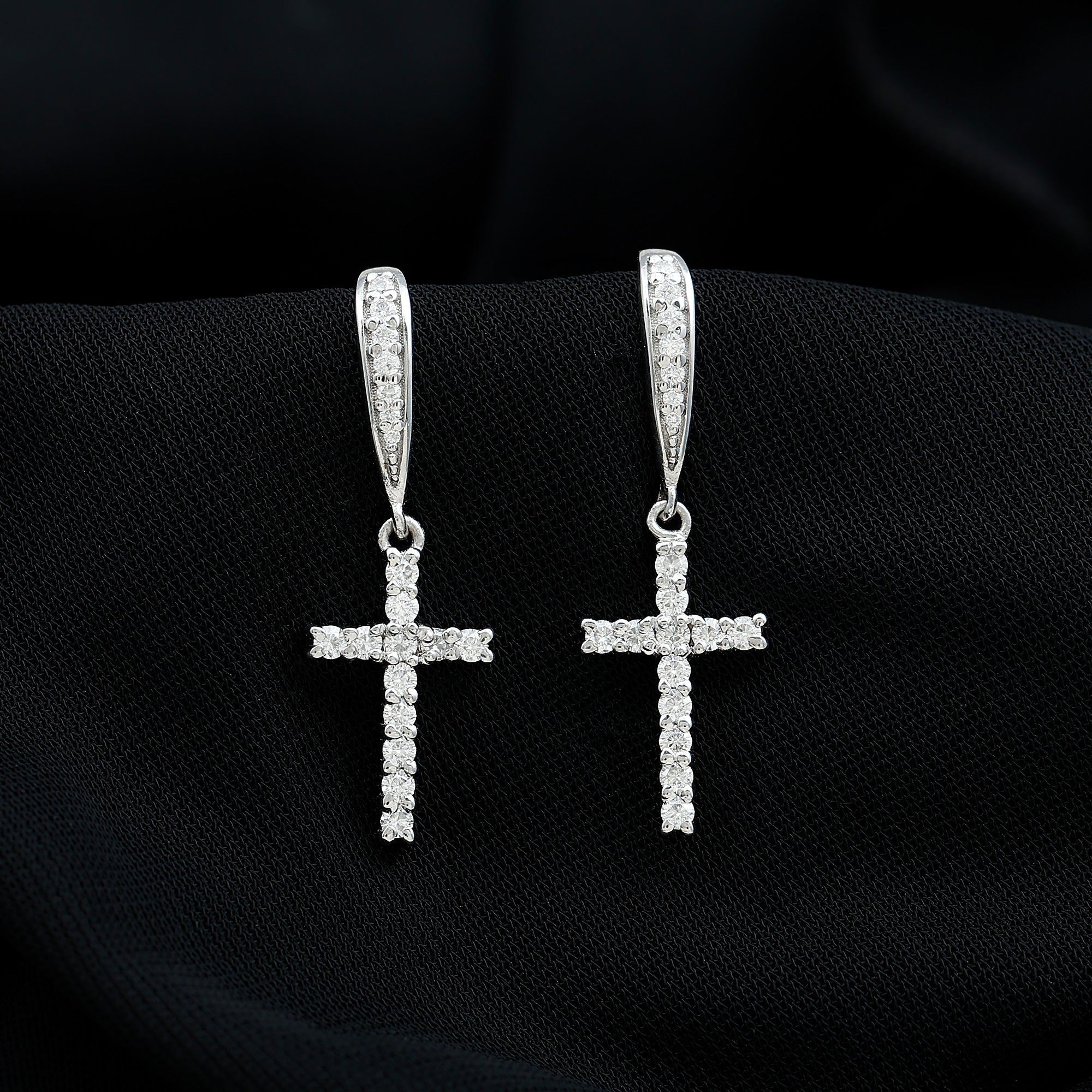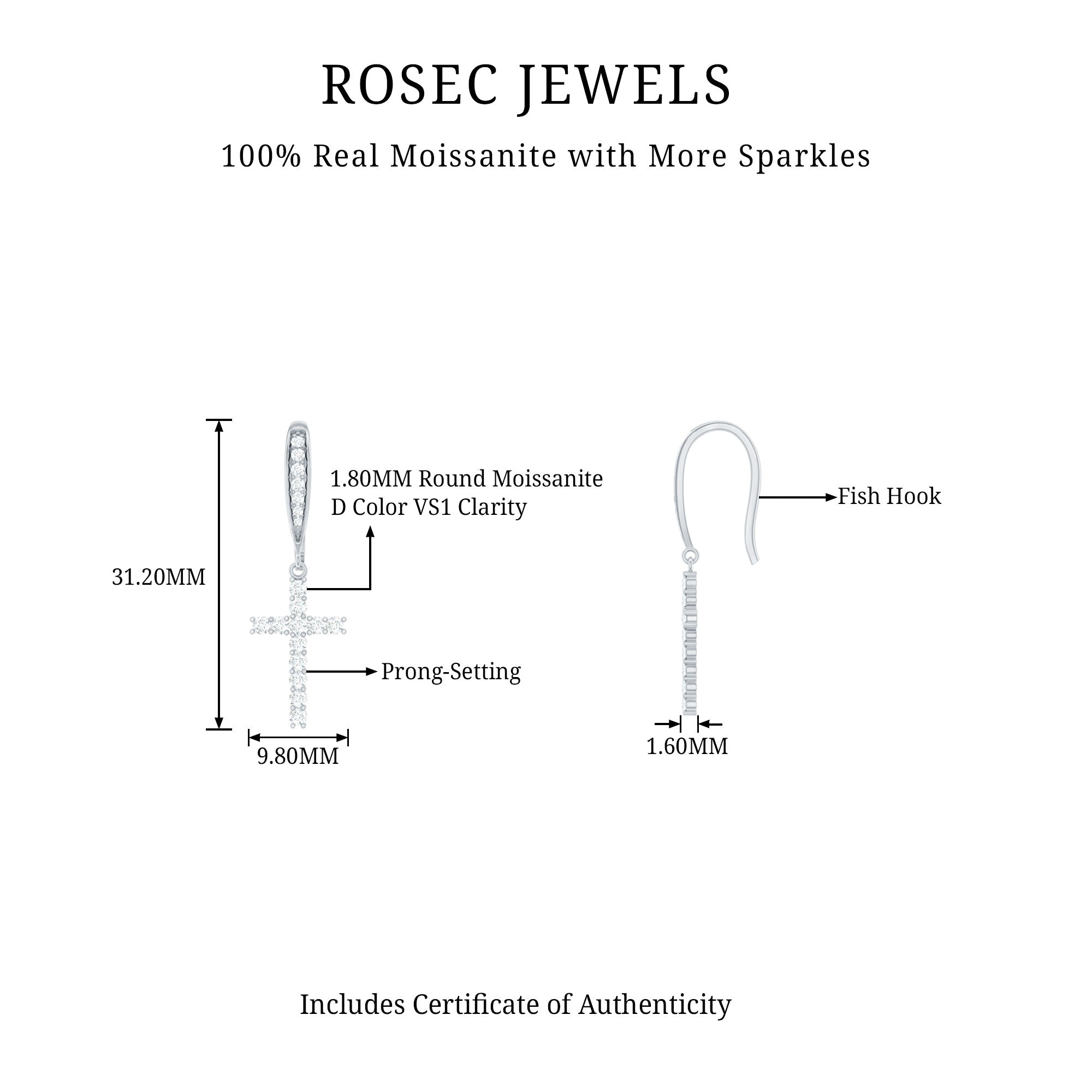 Show off your faith with these Moissanite Cross Earrings that represent spirituality and belief. They features prong set smaller round cut Moissanite stones set on the cross, hanging from moissanite-studded fish hook made of 14K White Gold Plated Silver. These Drop Dangle Earrings are a stylish way to keep your religious values close while looking fashionable. Designed for women, these Silver Cross Earrings shine with D Color and VS1 Clarity Moissanite, making them a great addition to your outfit for any special event. They also make a thoughtful gift for someone special to celebrate their faith. Plus, these Religious Earrings will arrive in a high-quality velvet pouch for safe storage when you are not wearing them.