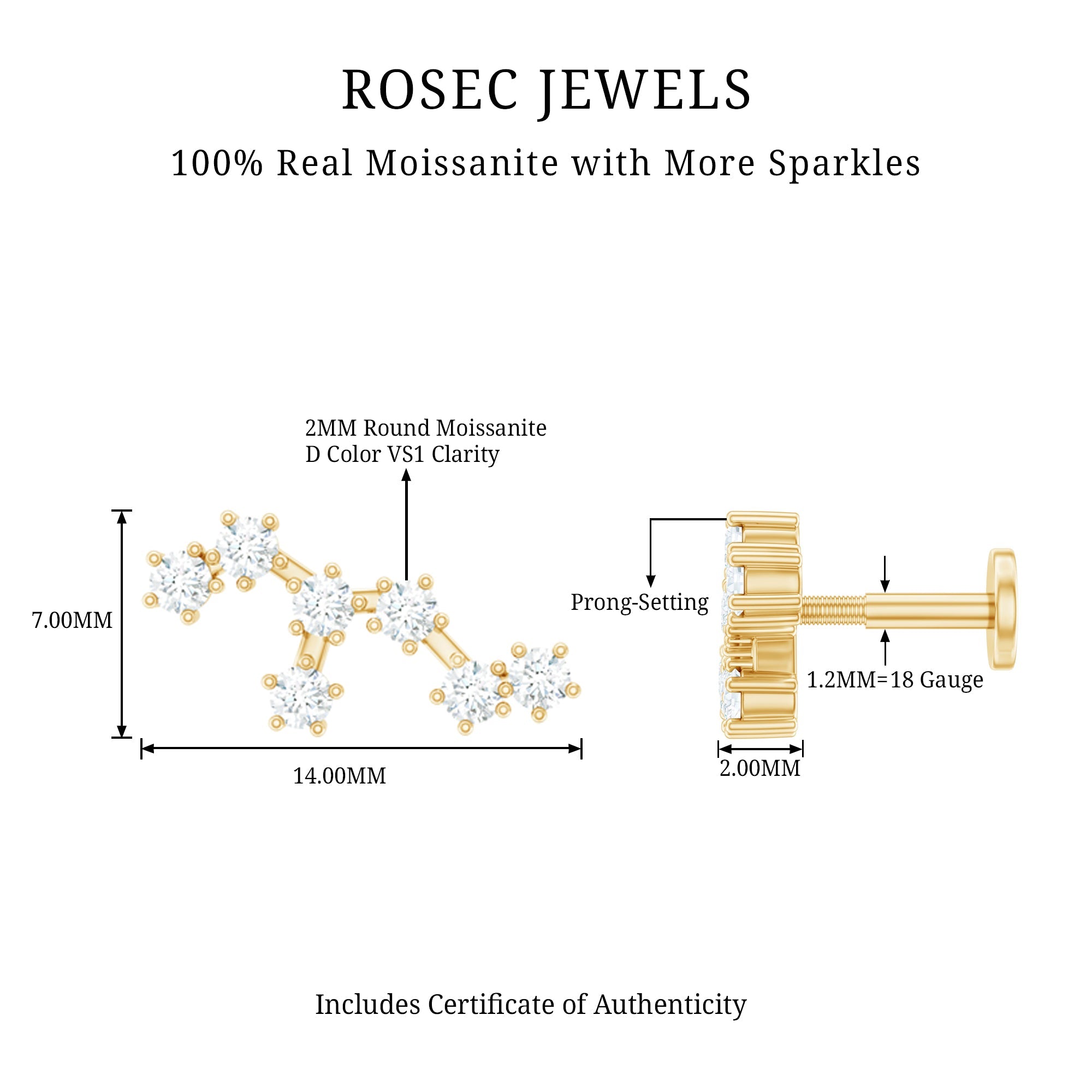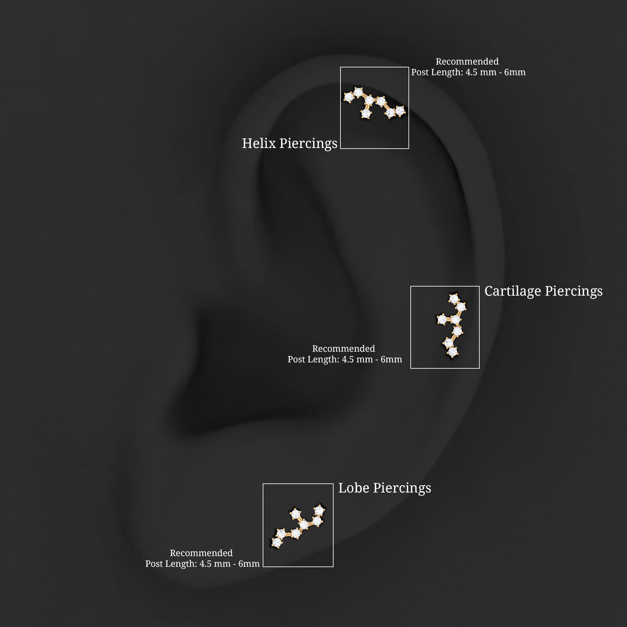 The Leo Zodiac Earring features a stunning star constellation design adorned with sparkling Round Cut Moissanite set in Prong Setting. This Ear Crawler can be worn on your Cartilage, Helix, or Upper Lobe Piercing and is secured in place with a Flat Back Closure. Perfect for any special occasion, this Constellation Earring makes a wonderful gift for Birthdays, Anniversaries, Bridesmaids, Christmas, Graduation, Friendship, and Sisters.