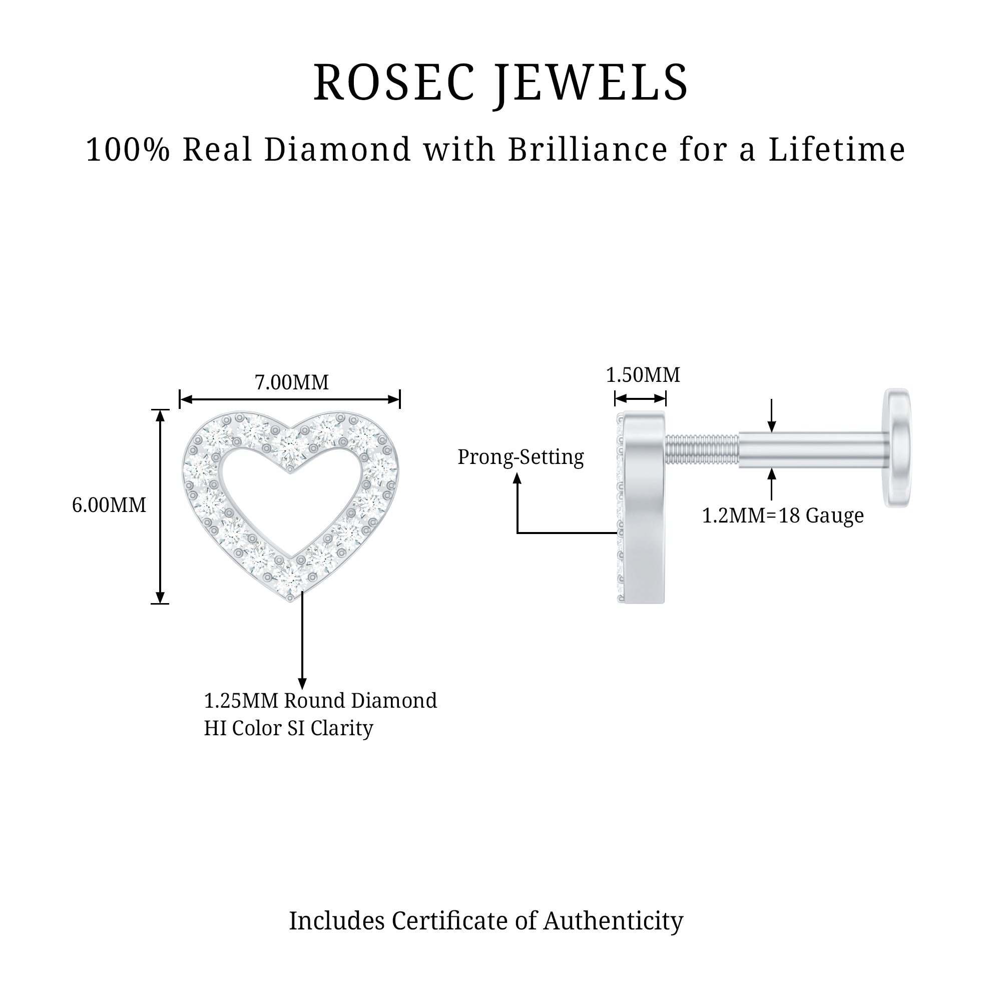 Cute Diamond Open Heart Earring for Helix Piercing ‐ Natural - ( HI-SI ) / 18K White Gold / Flat Back 5.5 MM