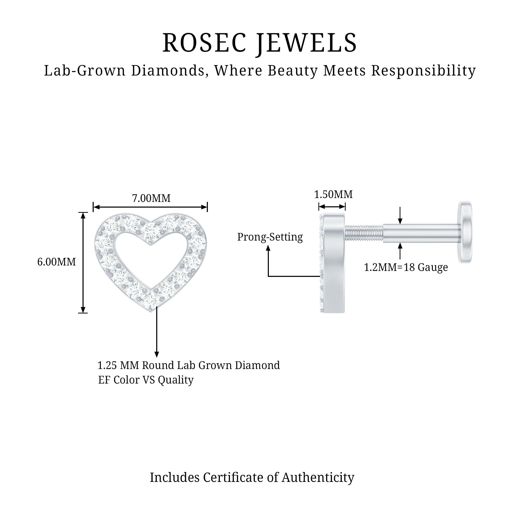 Cute Diamond Open Heart Earring for Helix Piercing ‐ Lab - ( EF-VS ) / 18K White Gold / Flat Back 5.5 MM