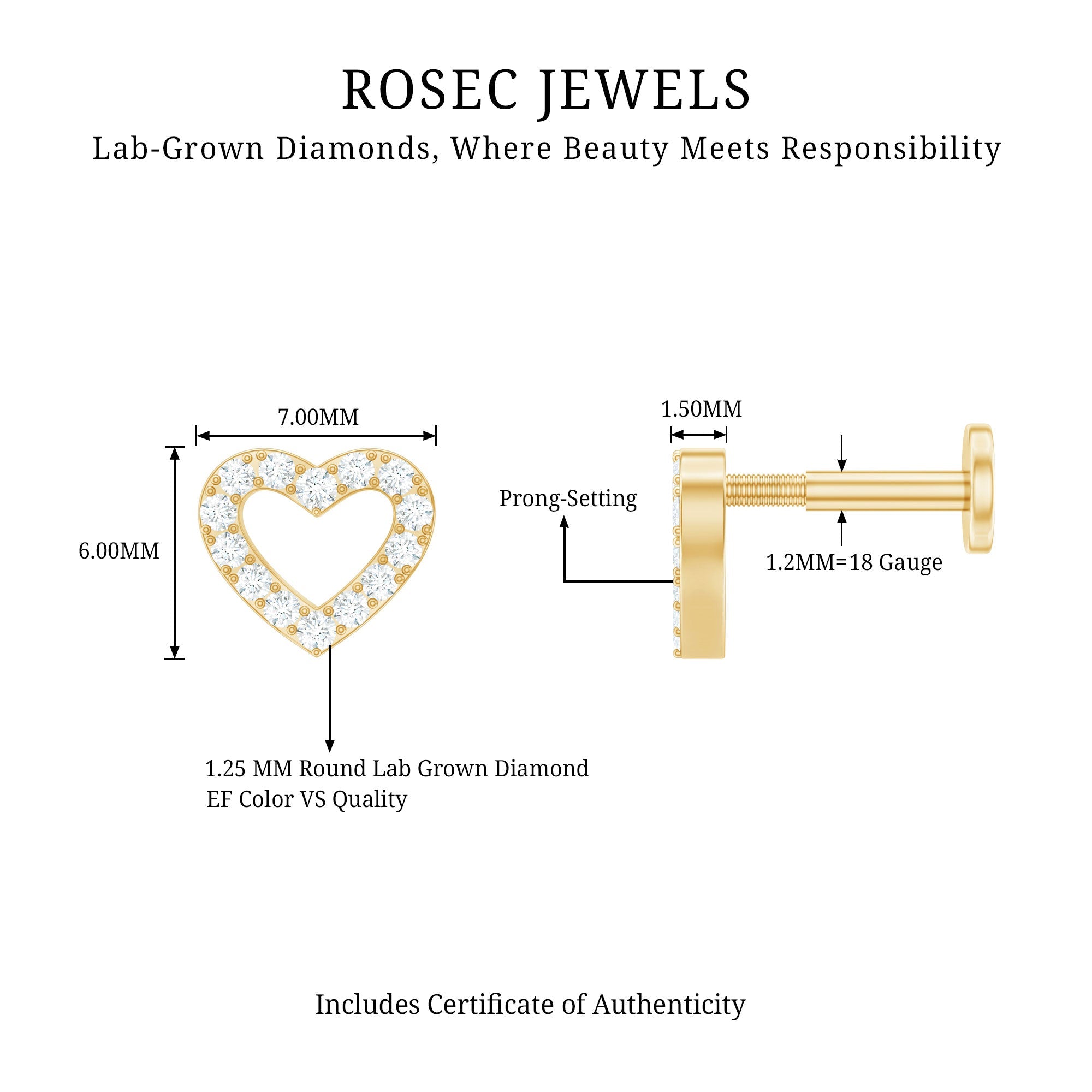 Cute Diamond Open Heart Earring for Helix Piercing ‐ Lab - ( EF-VS ) / 18K Yellow Gold / Flat Back 5.0 MM