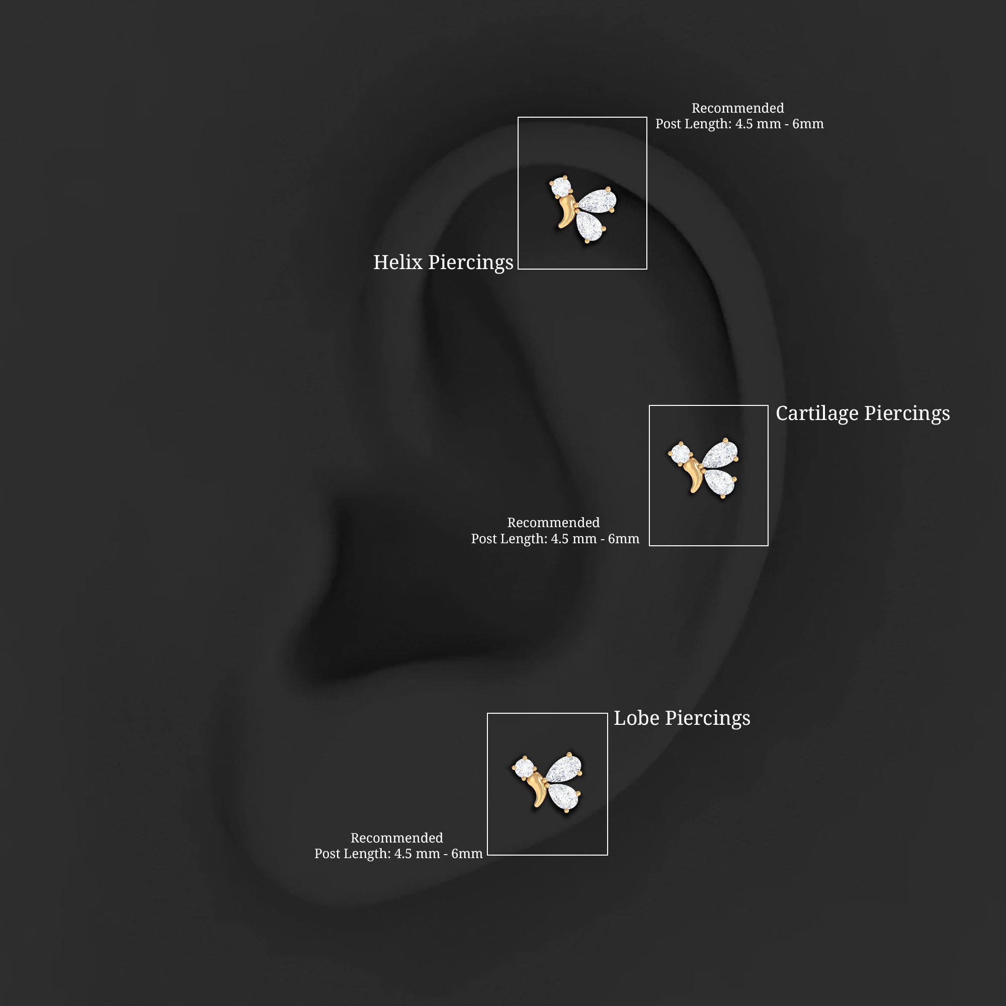 Our Moissanite Fly Earring is a captivating piece of jewelry that will leave everyone enchanted. It features Round and Pear Shape Moissanites set in Solid Metal, making it an eye-catching Piercing Jewelry. You can wear it on your Helix, Cartilage, or Upper Lobe Piercing. This Helix Earring would make a wonderful gift for her, adding happiness and laughter to her day.