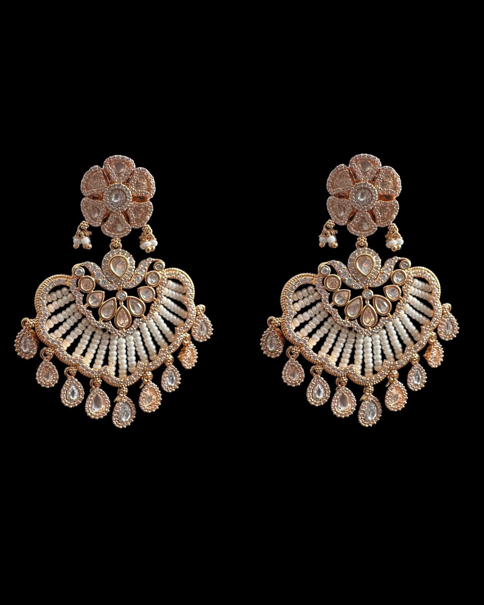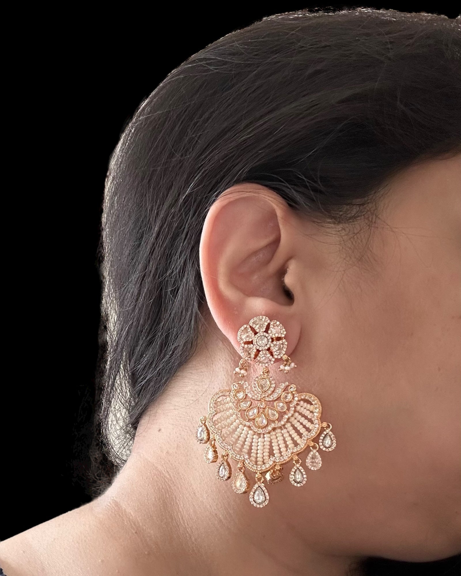 Polki earrings, gold-plated earrings, fan-shaped earrings, Indian earrings, bridal earrings, lightweight dangle earrings, ethnic jewelry, party wear jewelry, festive earrings, traditional earrings for women