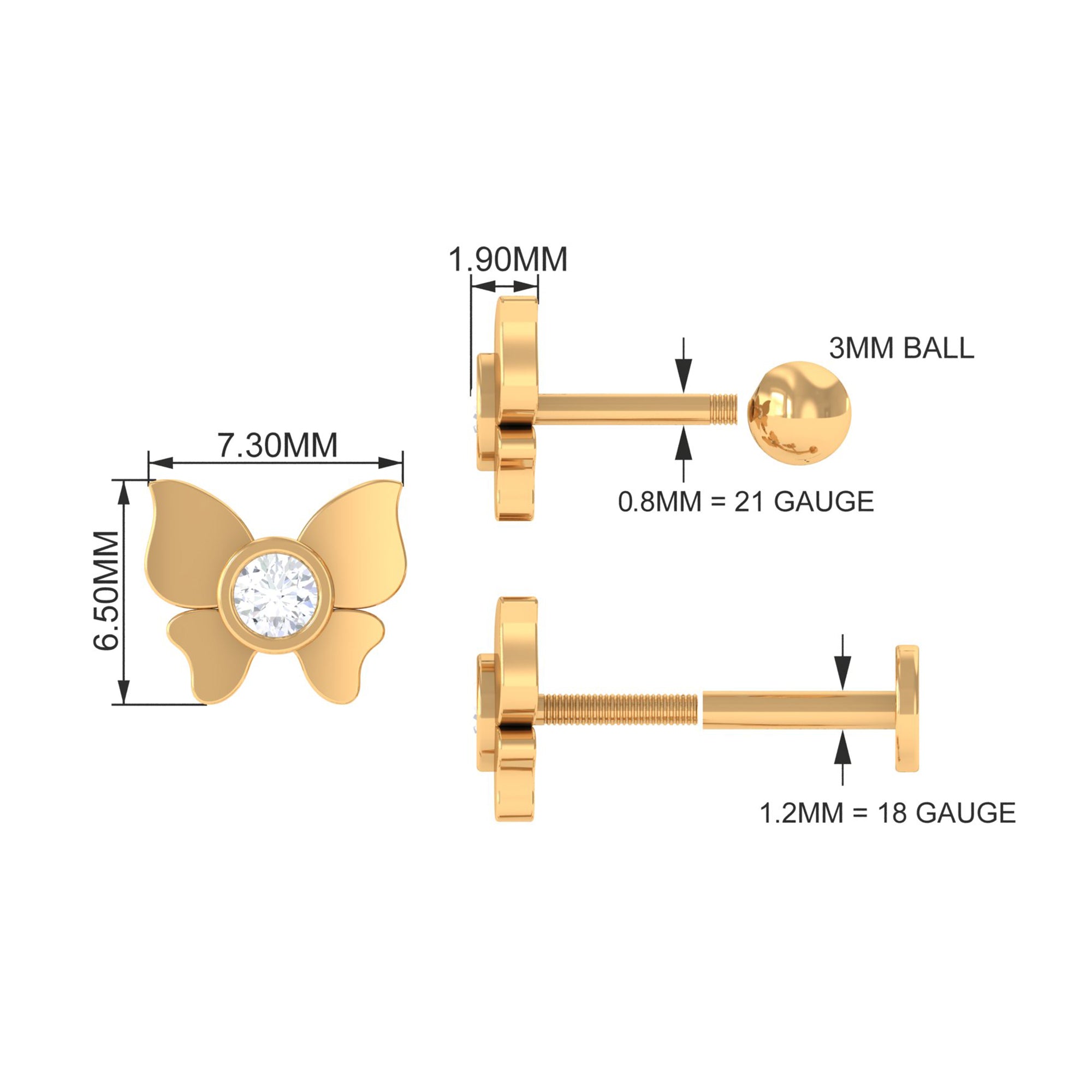 Diamond Butterfly Earring for Helix Piercing ‐ Lab - ( EF-VS ) / 18K Yellow Gold / Flat Back 6.5 MM