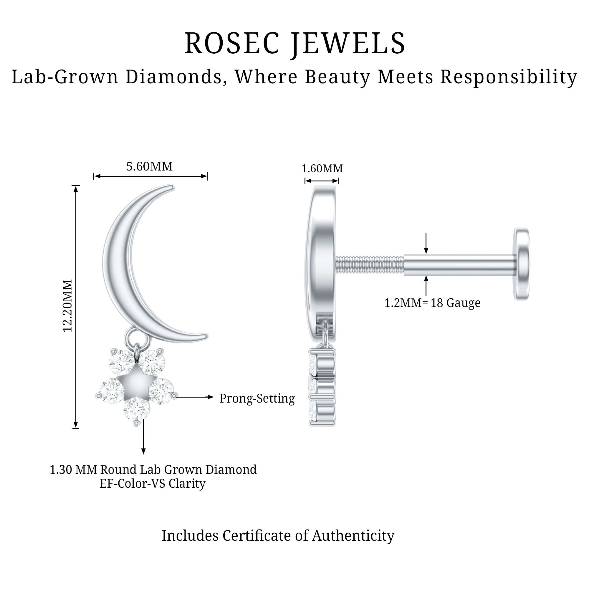 Diamond Crescent Moon and Star Earring for Helix Piercing ‐ Lab - ( EF-VS ) / 14K White Gold / Flat Back 4.5 MM