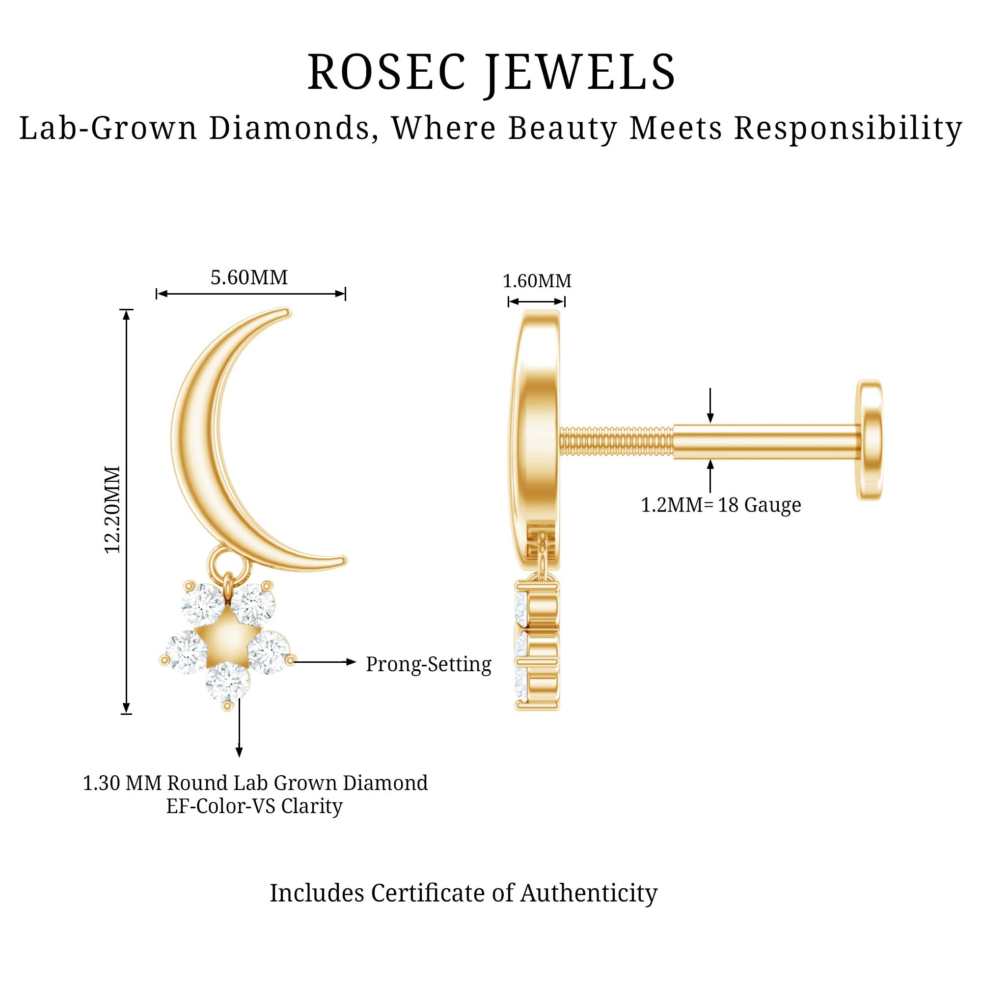 Diamond Crescent Moon and Star Earring for Helix Piercing ‐ Lab - ( EF-VS ) / 18K Yellow Gold / Flat Back 4.5 MM