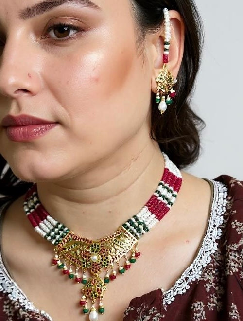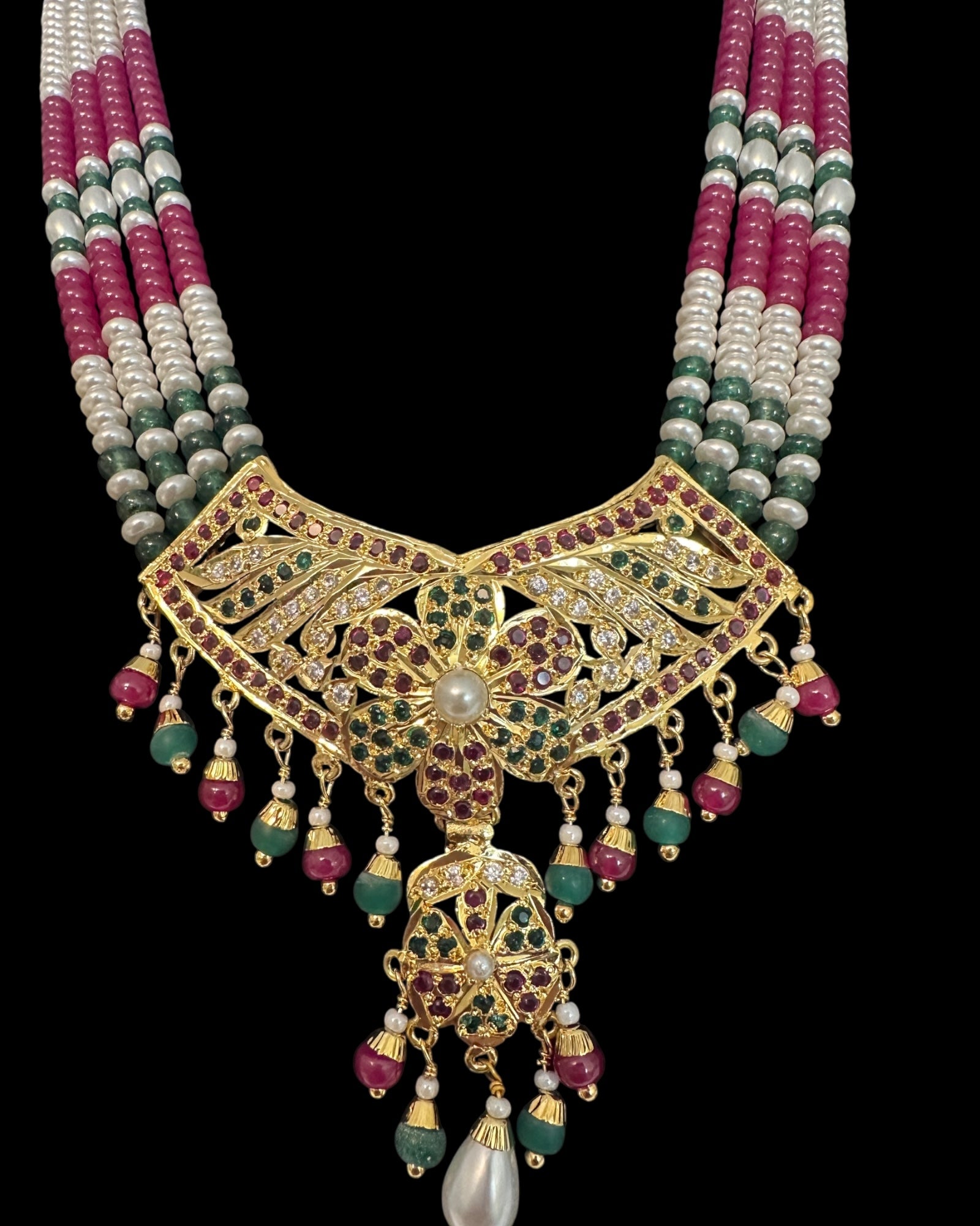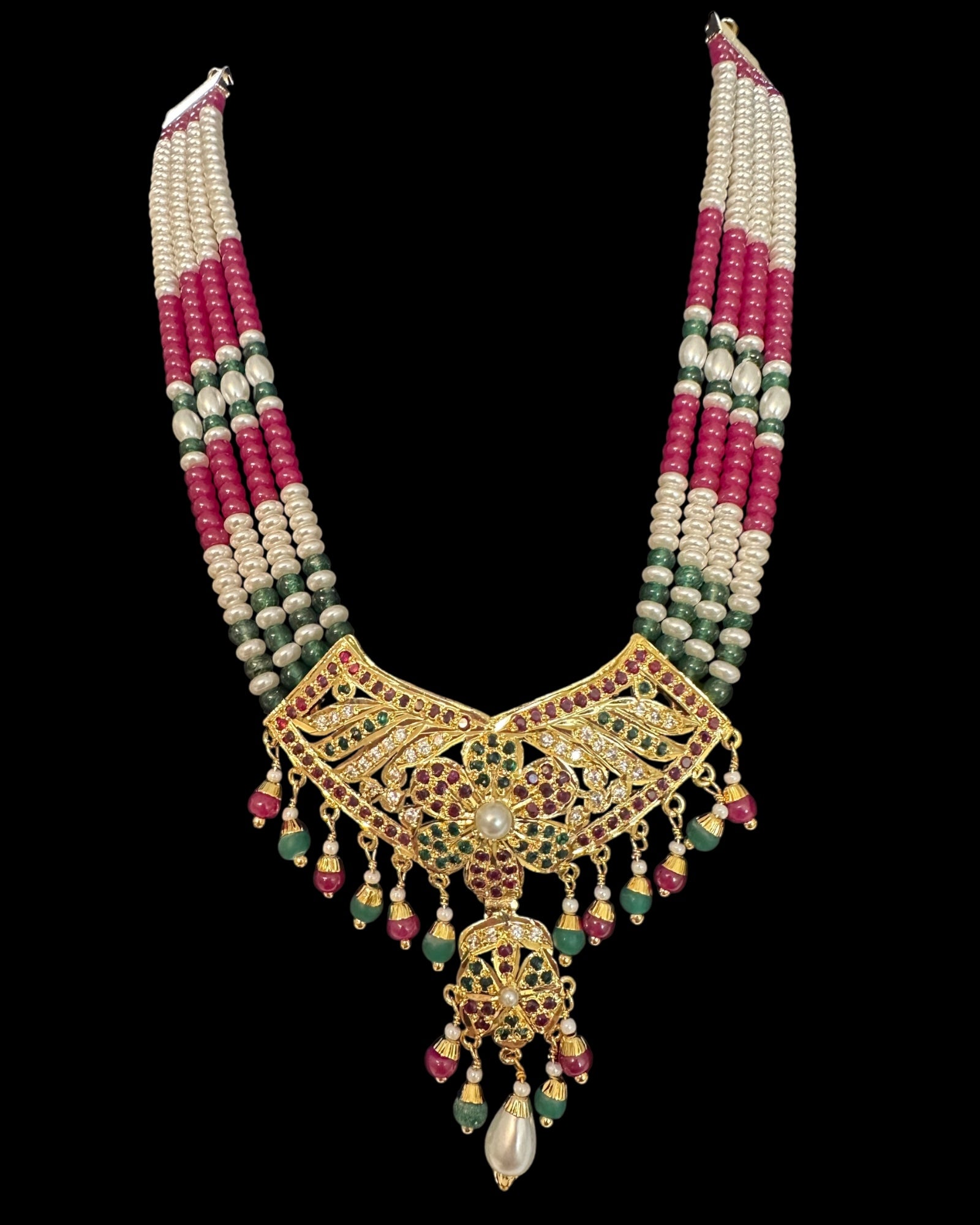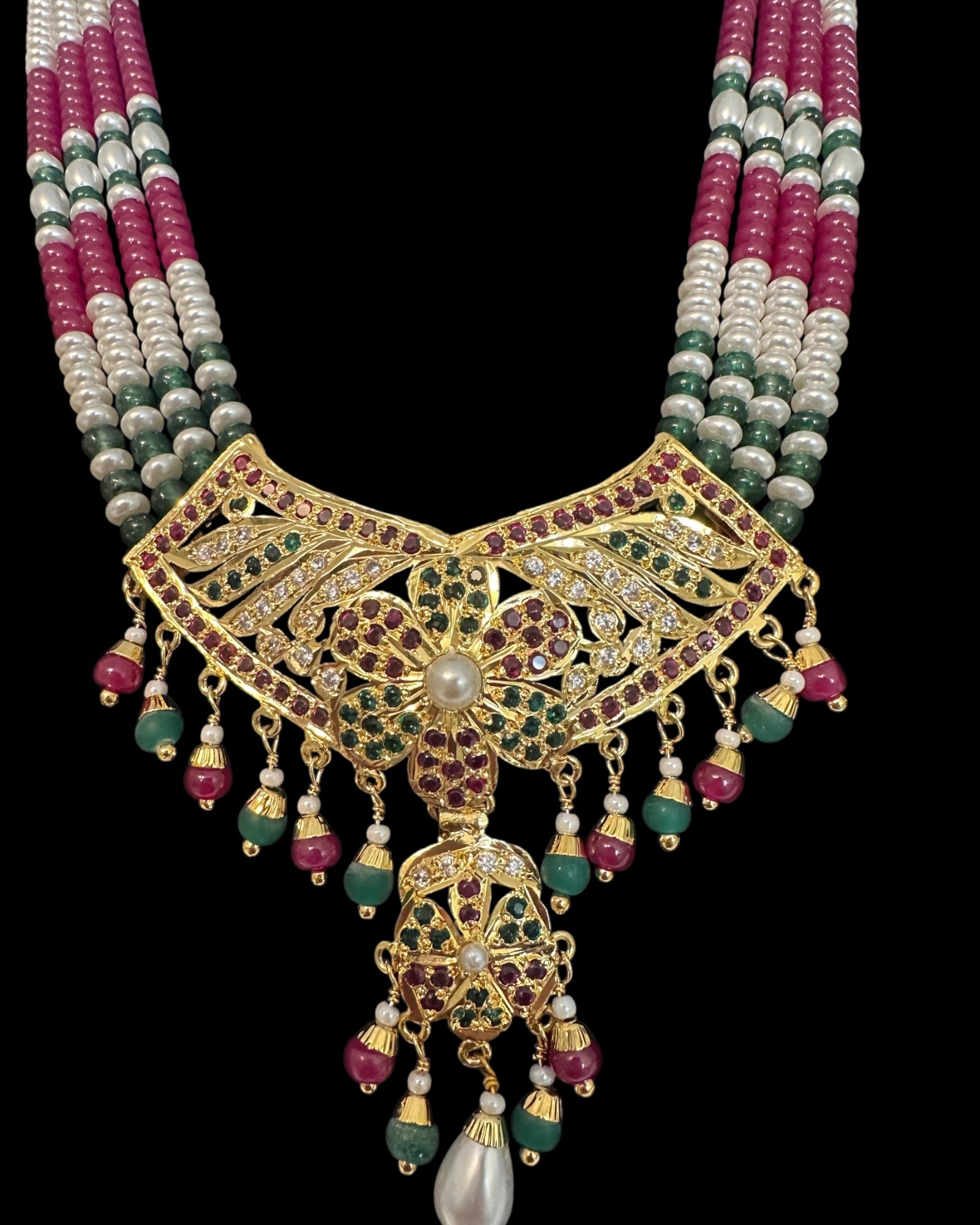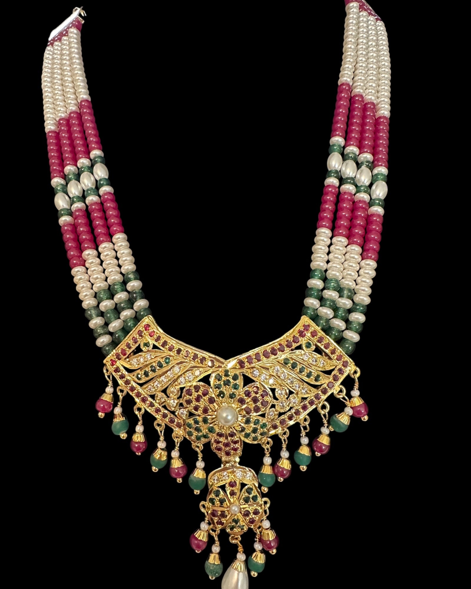 DNS207 Jadau necklace with earrings in ruby emerald zircon and real pearls ( READY TO SHIP )
