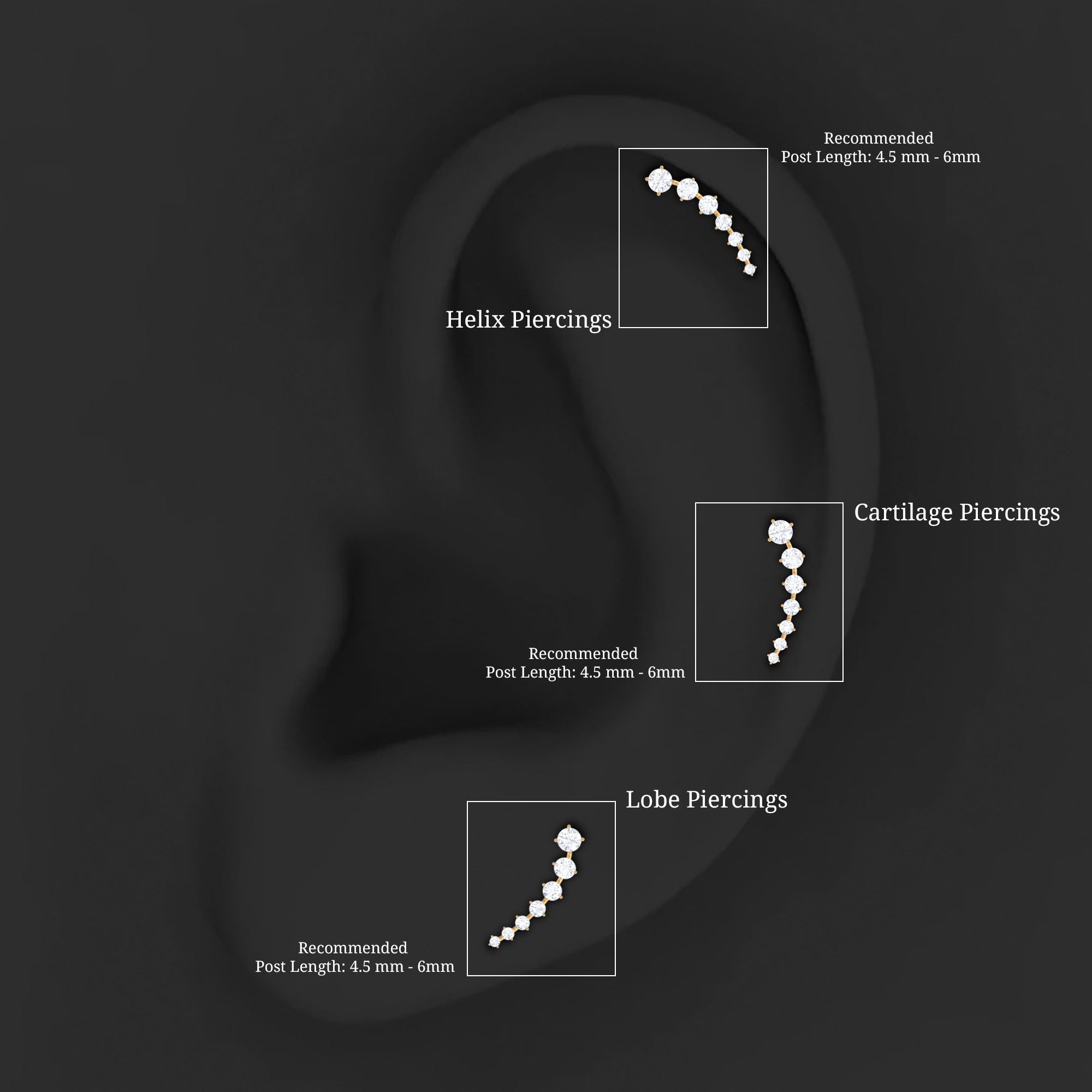This Graduated Style Moissanite Ear Crawler Earring showcases a beautiful curved design with sparkling Round Cut Moissanites arranged in descending order and secured by prong setting. This stylish Ear Climber Earring can be worn on your Helix, Cartilage, or Upper Lobe Piercing, and the Flat Back Closure ensures a comfortable and secure fit. This elegant piece of jewelry adds a touch of sophistication and glamour to any outfit, making it perfect for both formal and casual occasions.