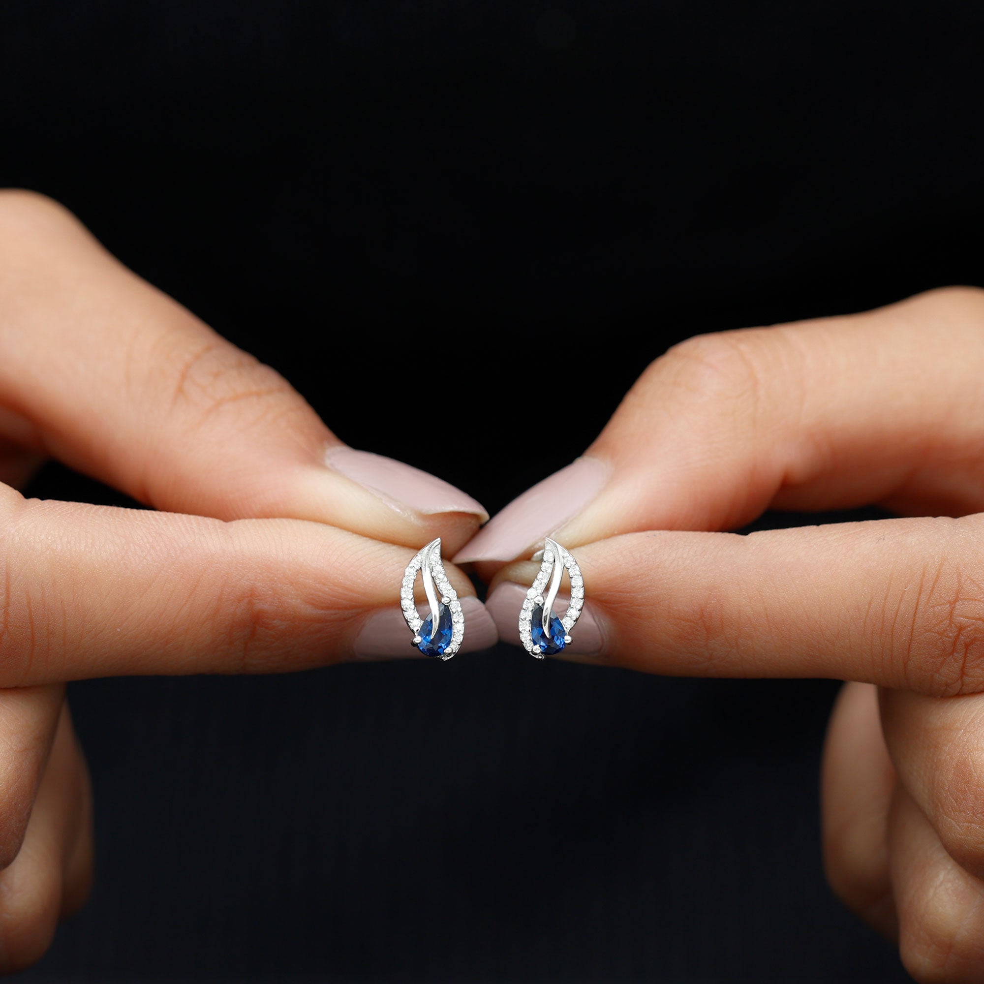 These stunning Sapphire Leaf Earrings beautifully blend elegance and shine, making them ideal for everyday use or special occasions. Crafted from sterling silver and plated with 14k white gold, they amplify the hue and brilliance of each lab-created blue sapphire. At the center of these Silver Stud Earrings is a 4X6 MM pear-shaped lab-made blue sapphire, elegantly set in a classic prong setting. They are complemented by delicate round brilliant-cut moissanite stones. The unique metal curve motif draws attention to the core of the design. These Lab Grown Blue Sapphire Earrings are the perfect example of subtle elegance, classy style, and timeless charm, guaranteed to catch the attention of even the pickiest observers. These Everyday Stud Earrings feature a secure screw back closure that guarantees both comfort and safety.