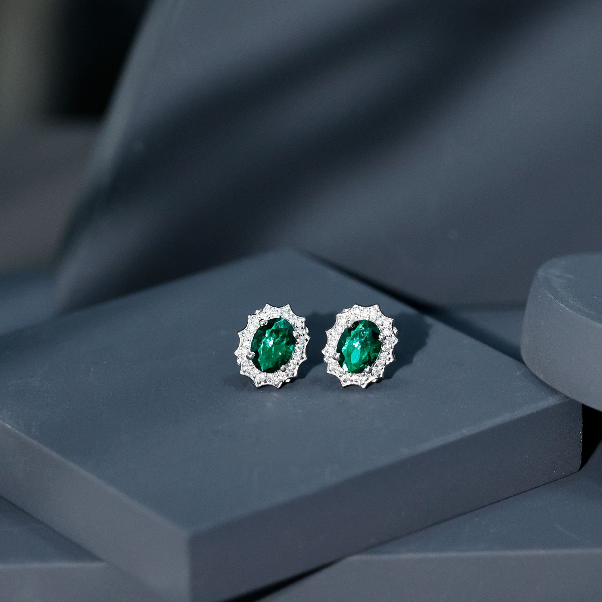 A touch of old world charm, wrapped in modern brilliance, these Vintage Emerald Earrings are a piece of art. Crafted from 14k white gold plated silver, the design features a stud style that secures with a simple screw back closure for maximum comfort. It showcases a stunning prong set 6X8 MM oval cut lab created emerald encircled by a vintage-inspired halo of delicate, sparkling round brilliant-cut moissanite stones. Each of these beautiful lab grown emerald stones has been selected for their deep hue and AAAA quality, perfectly complementing the brilliance of the D color VS1 clarity Moissanite stones. These Halo Stud Earrings make a perfect Valentines Day gift for girlfriend, 1st anniversary gift for wife, birthday gift for mom, and graduation gift for friend. These gorgeous Lab Grown Emerald Stud Earrings are presented in a velvet pouch and come with a certificate of authenticity.