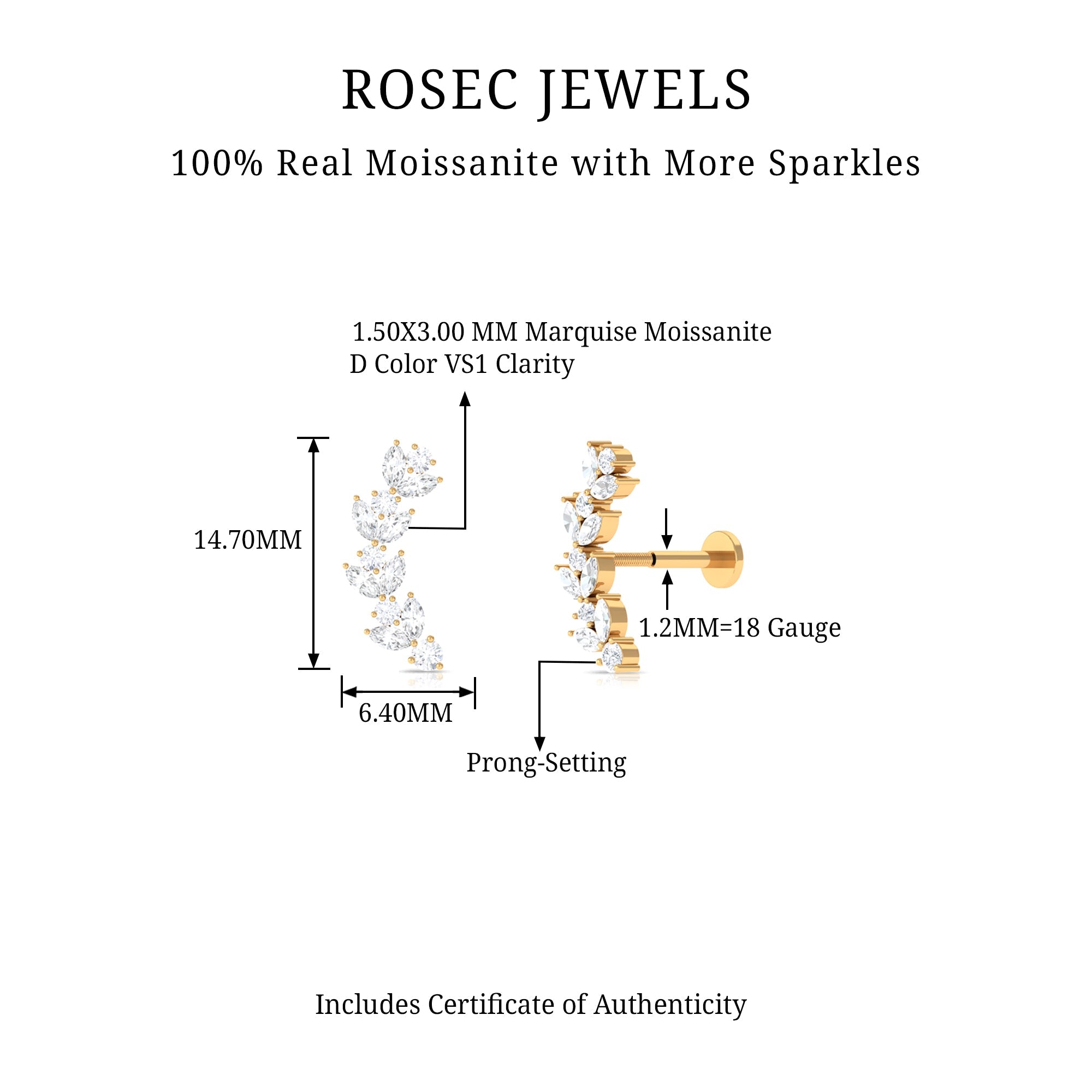 Marquise and Round Moissanite Leaf Branch Helix Earring ‐ D-VS1 / 18K Yellow Gold / Flat Back 7.5 MM