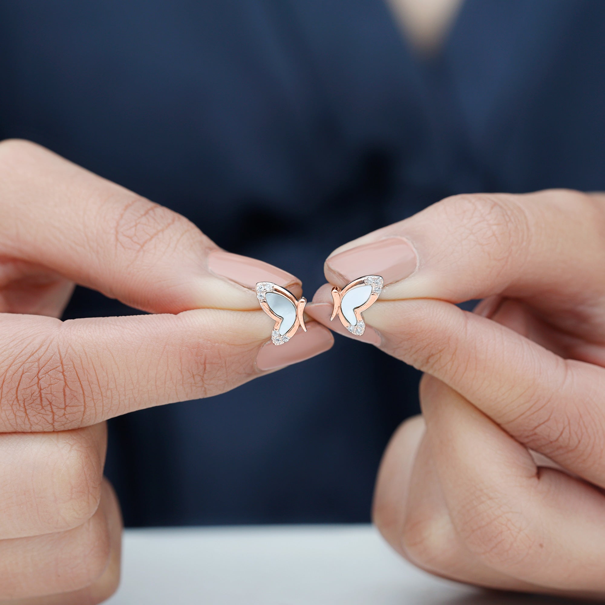 Delicate, dreamy, and designed to impress - these Mother of Pearl Stud Earrings are a graceful blend of elegance and whimsy. Crafted in sterling silver and plated with 14k white gold, each Butterfly Stud Earring is accented with shimmering round cut simulated diamonds and a center Mother of Pearl stone set in Bezel Setting. Known for their calming elegance and timeless beauty, MOP gemstones adds a natural elegance that contrasts beautifully with the sparkle of the simulated diamonds and the sleek metal finish. Set with secure screw back closures, these Pearl and Diamond Stud Earrings are perfect for everyday elegance or adding a playful sophistication to your evening ensemble. Whether you are gifting someone special or treating yourself, these Pearl Butterfly Earrings are ideal for birthdays, anniversaries, or as a sweet surprise. Comes with a certificate of authenticity, ensuring their quality and value and presented in a premium quality velvet pouch, these Silver Pearl Earrings upgrade your everyday look with their unique beauty.