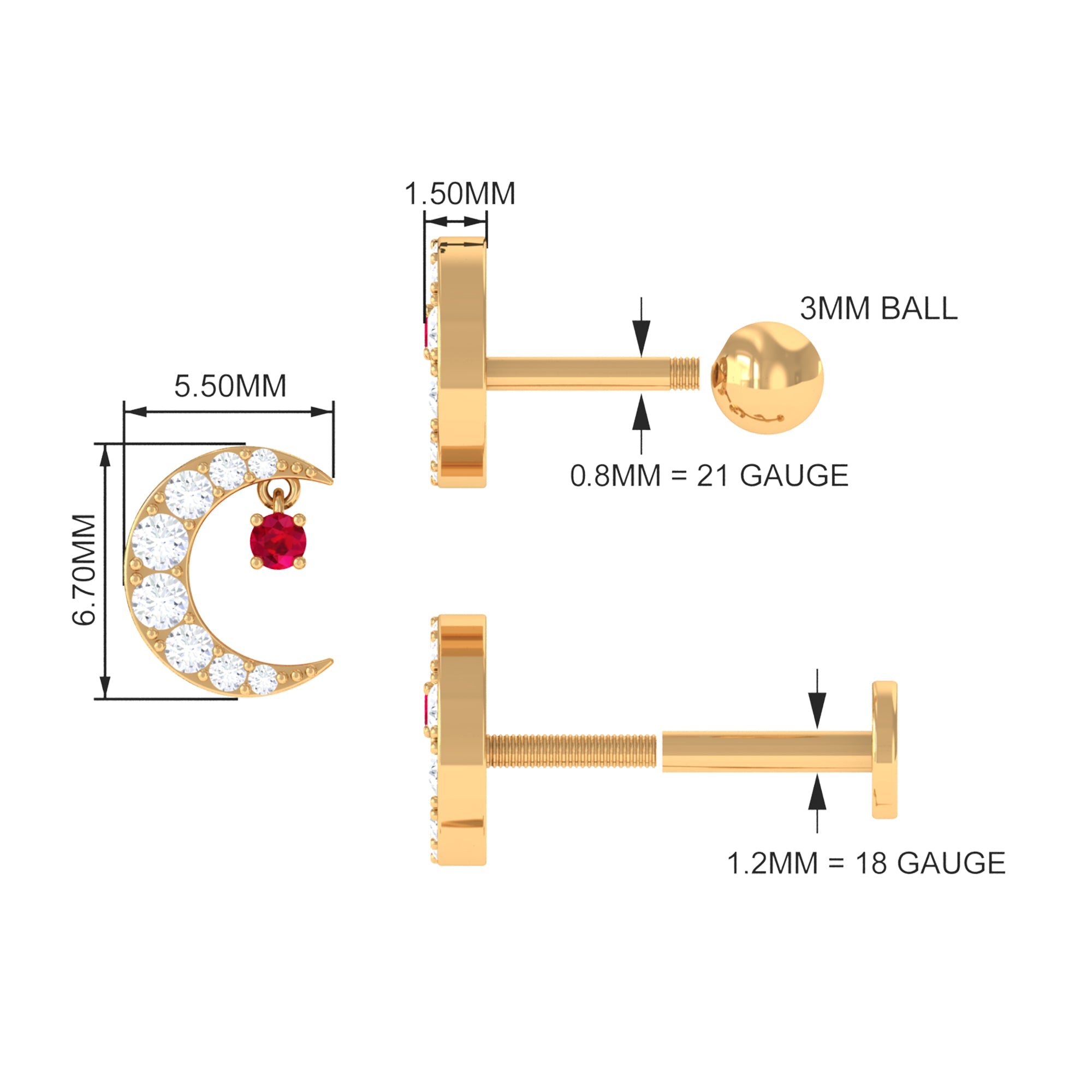 Natural Red Ruby Crescent Moon Helix Earring with Moissanite ‐ AAA / 14K Yellow Gold / Flat Back 5.5 MM