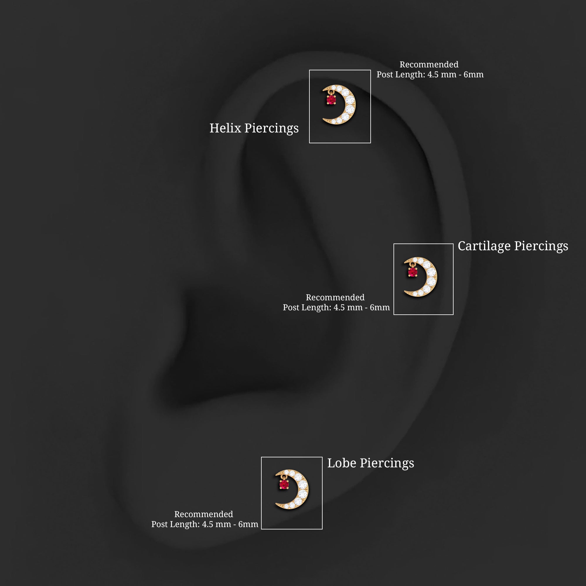 Natural Red Ruby Crescent Moon Helix Earring with Moissanite ‐ AAA / 14K Yellow Gold / Flat Back 4.5 MM