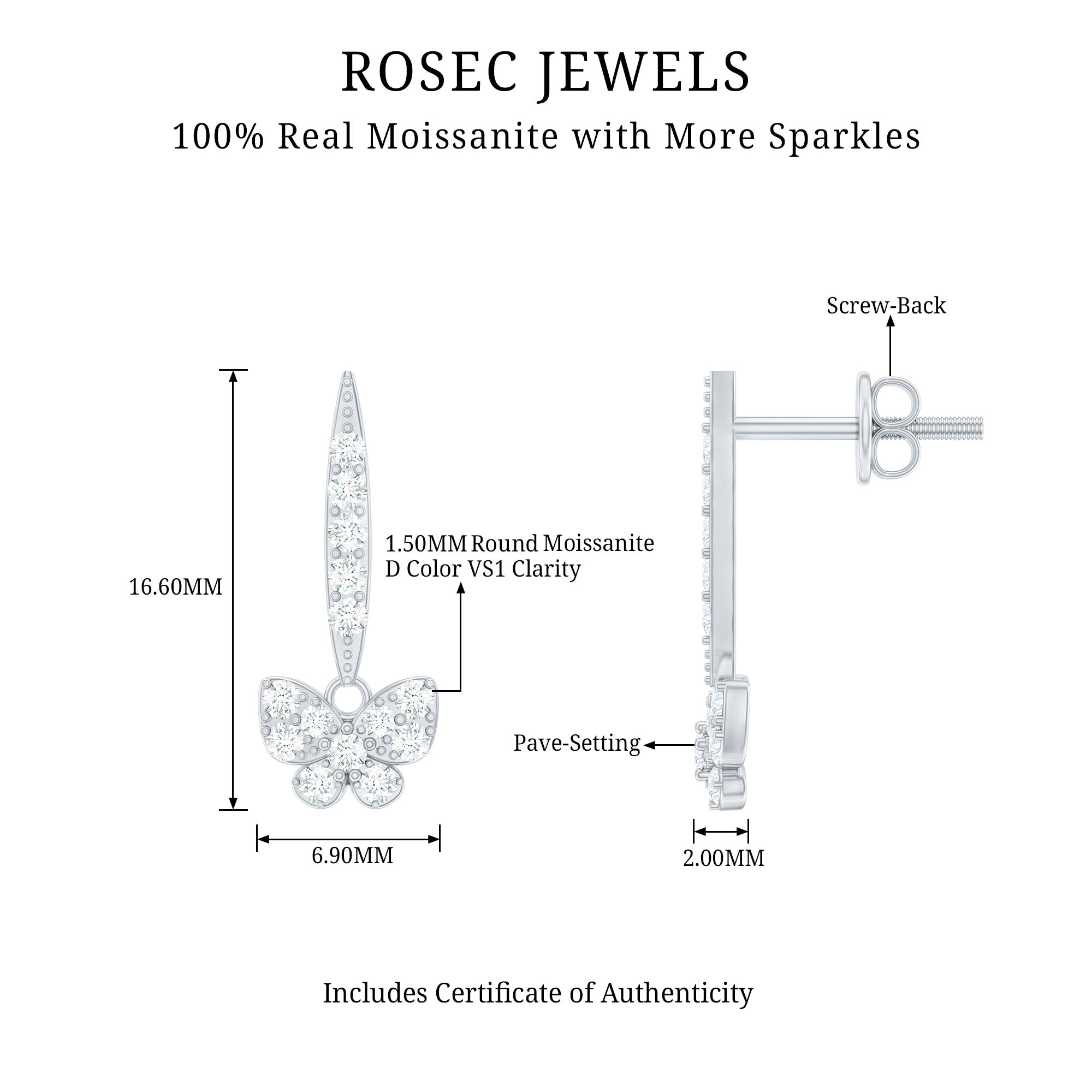 Pave Set Moissanite Butterfly Drop Earrings for Women ‐ D-VS1 / 92.5 Sterling Silver