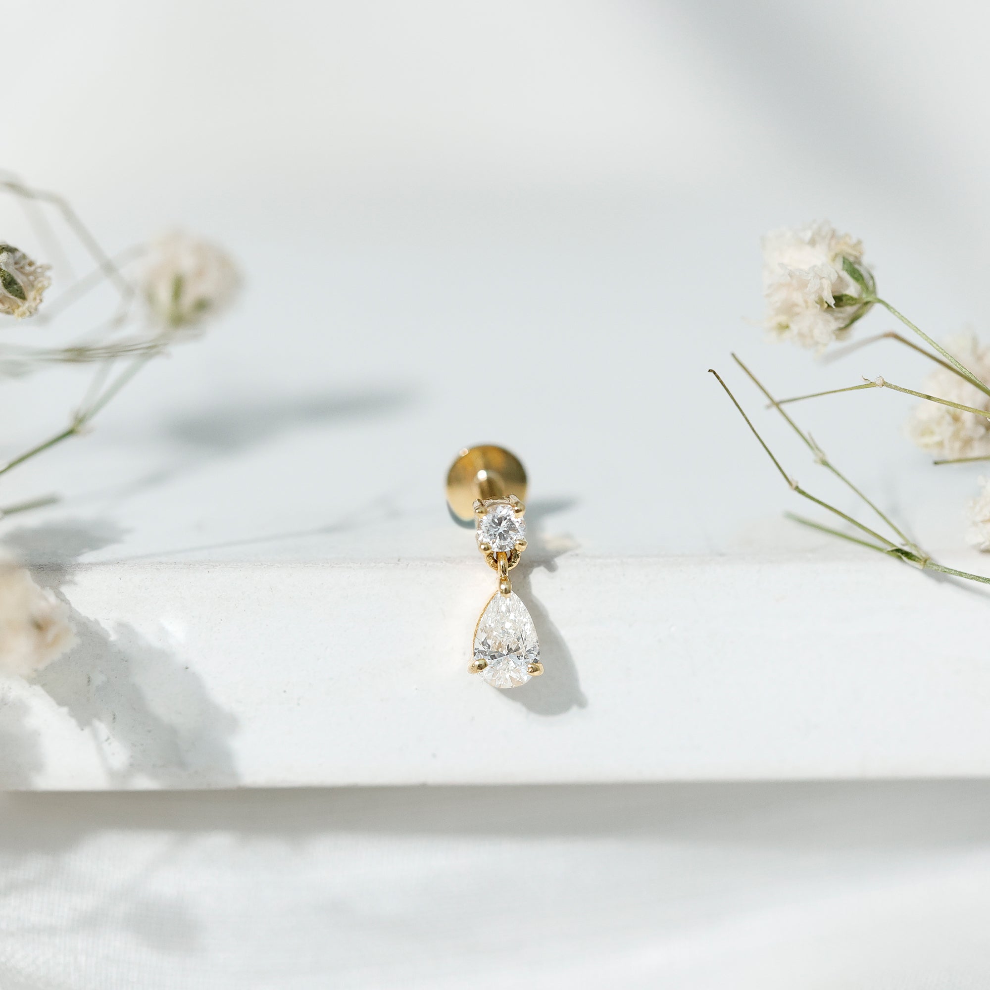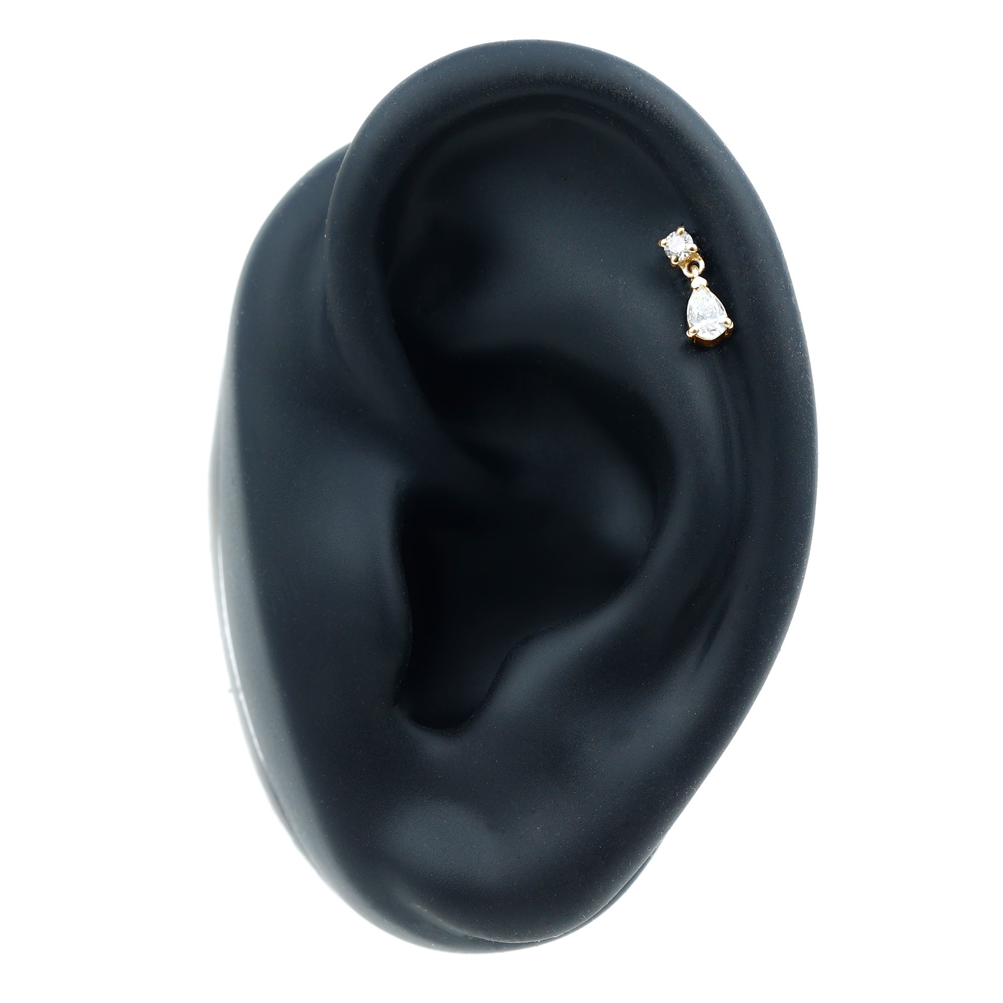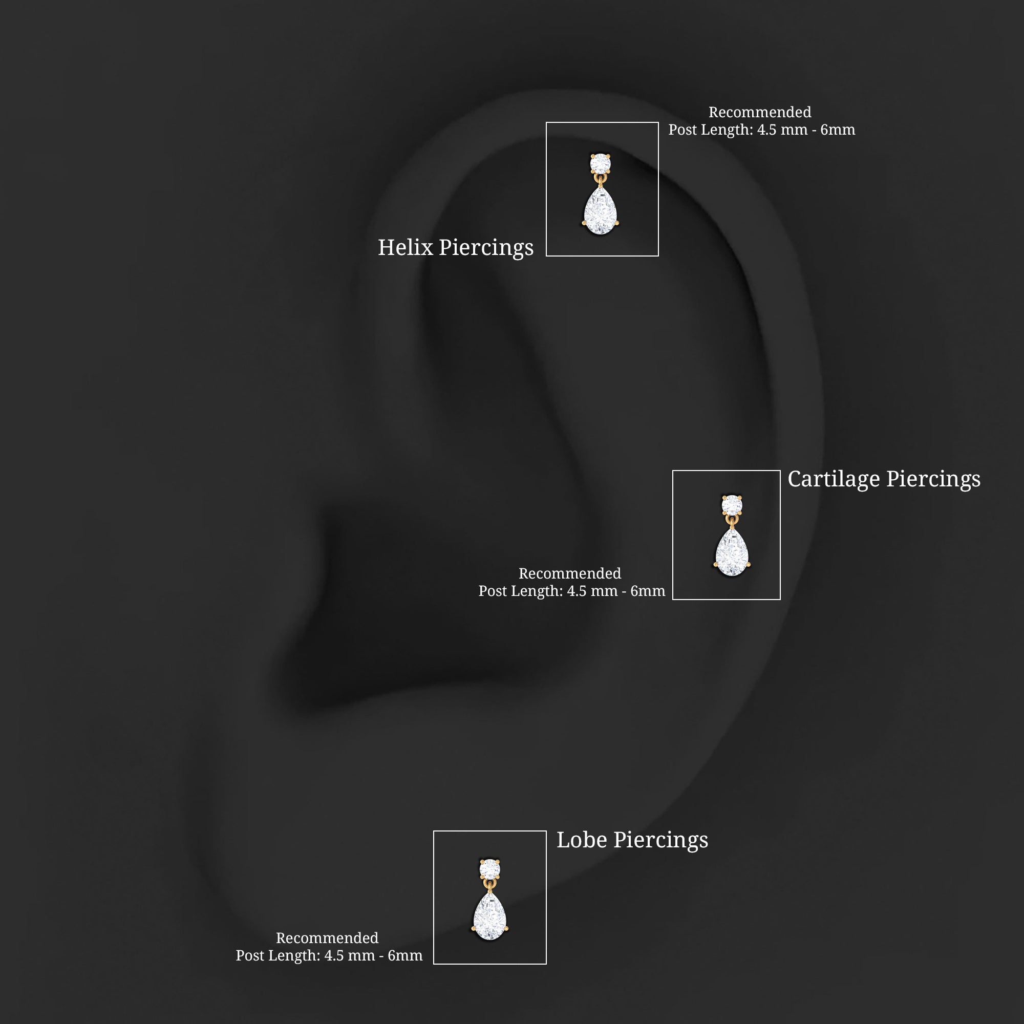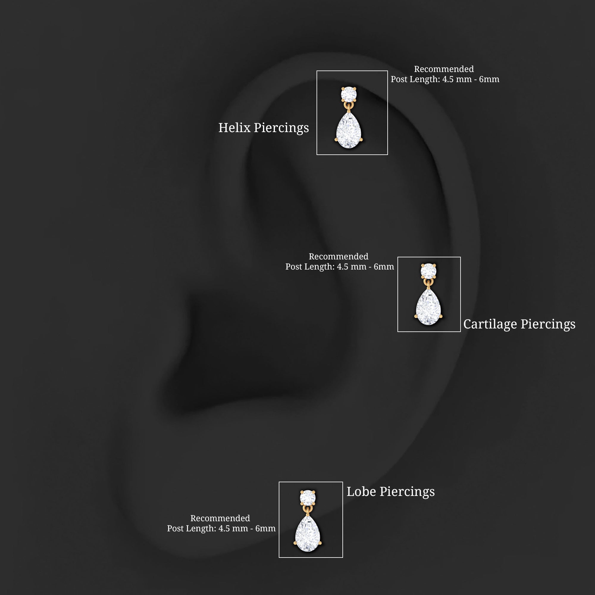 This Diamond Drop Helix Earring features a Round Cut Diamond stud and a Pear Cut Diamond drop in Prong Setting. Perfect for wearing solo or stacking with other ear jewelry pieces, this Diamond Dangle Earring is a must-have for any fashion-forward woman. You can style this Piercing Earring on your Helix, Cartilage, or Upper Lobe Piercing.