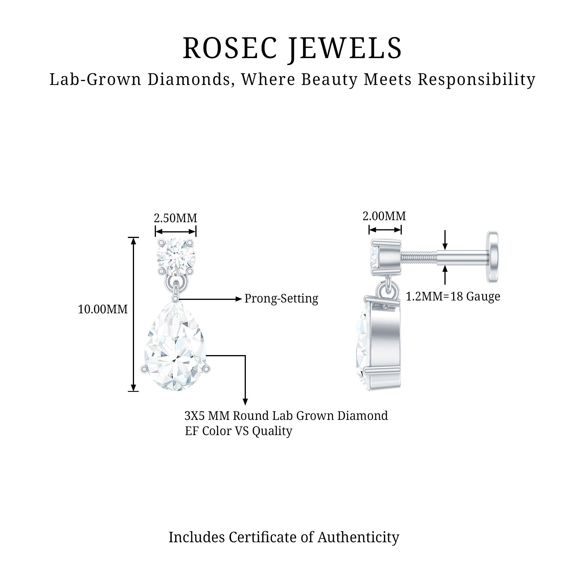 Pear and Round Cut Diamond Stud Drop Helix Earring ‐ Lab - ( EF-VS ) / 10K White Gold / Flat Back 5.5 MM
