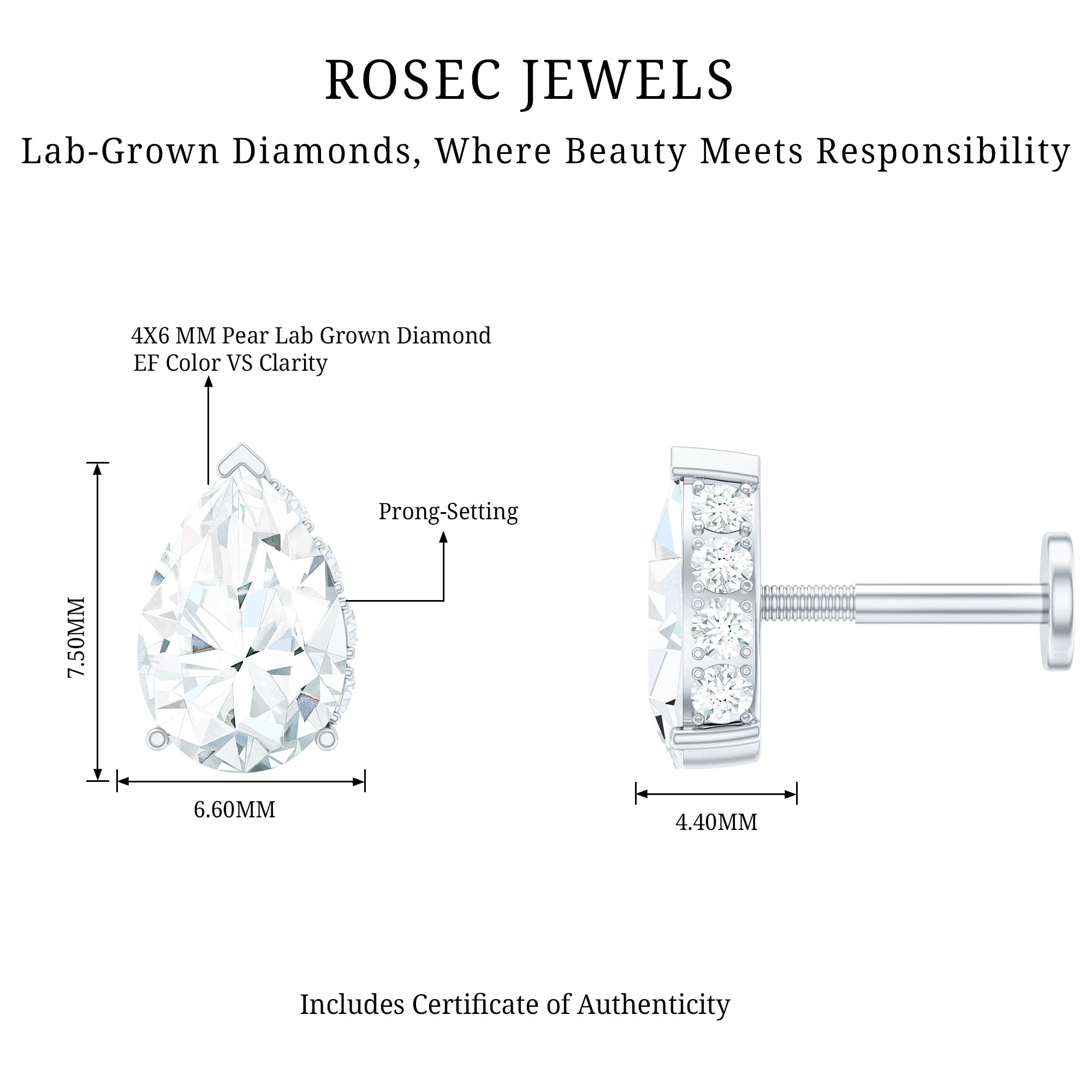 Pear Shaped Moissanite Solitaire Cartilage Earring ‐ D-VS1 / 18K White Gold / Flat Back 6.0 MM