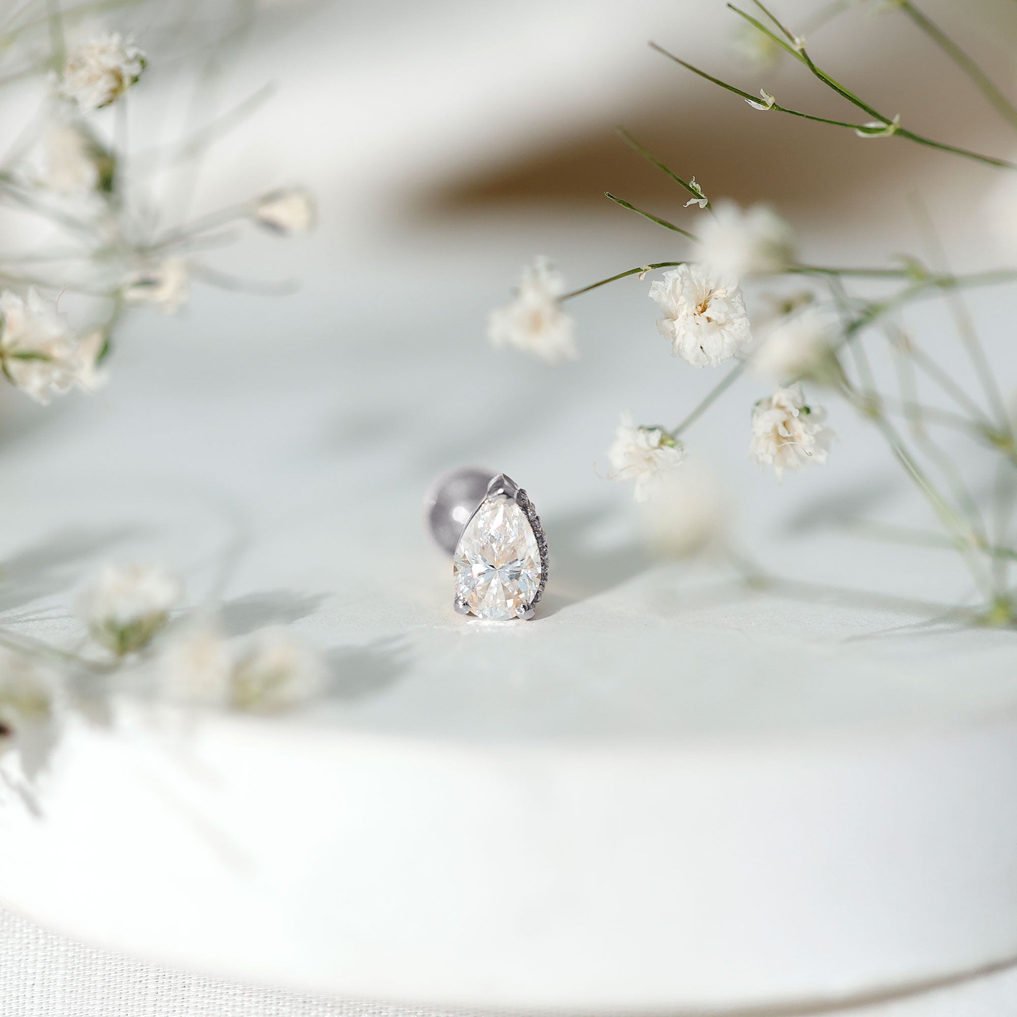 Pear Shaped Moissanite Solitaire Cartilage Earring ‐ D-VS1 / 18K White Gold / Flat Back 7.0 MM
