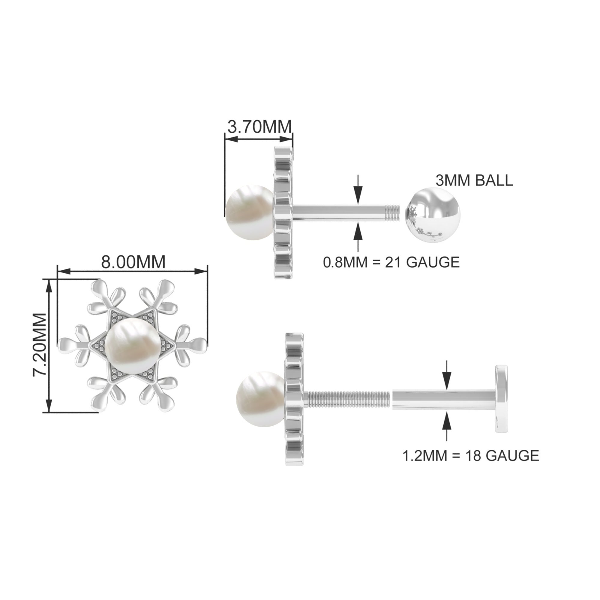 Experience the loveliness of the winter season by donning our exquisite Snowflake Pearl Solitaire Snowflake Earring. Adorned with Round Shape Freshwater Pearl set in Bead Setting on a unique snowflake design, crafted with hallmarked metal. You can style this Pearl Earring on your multiple piercings like Helix, Cartilage, Tragus, Conch, or Upper Lobe Piercing. Present this Solitaire Earring to mom, wife, girlfriend, daughter, family, or friend as its a special Christmas Gift and capture a precious place in their heart forever.