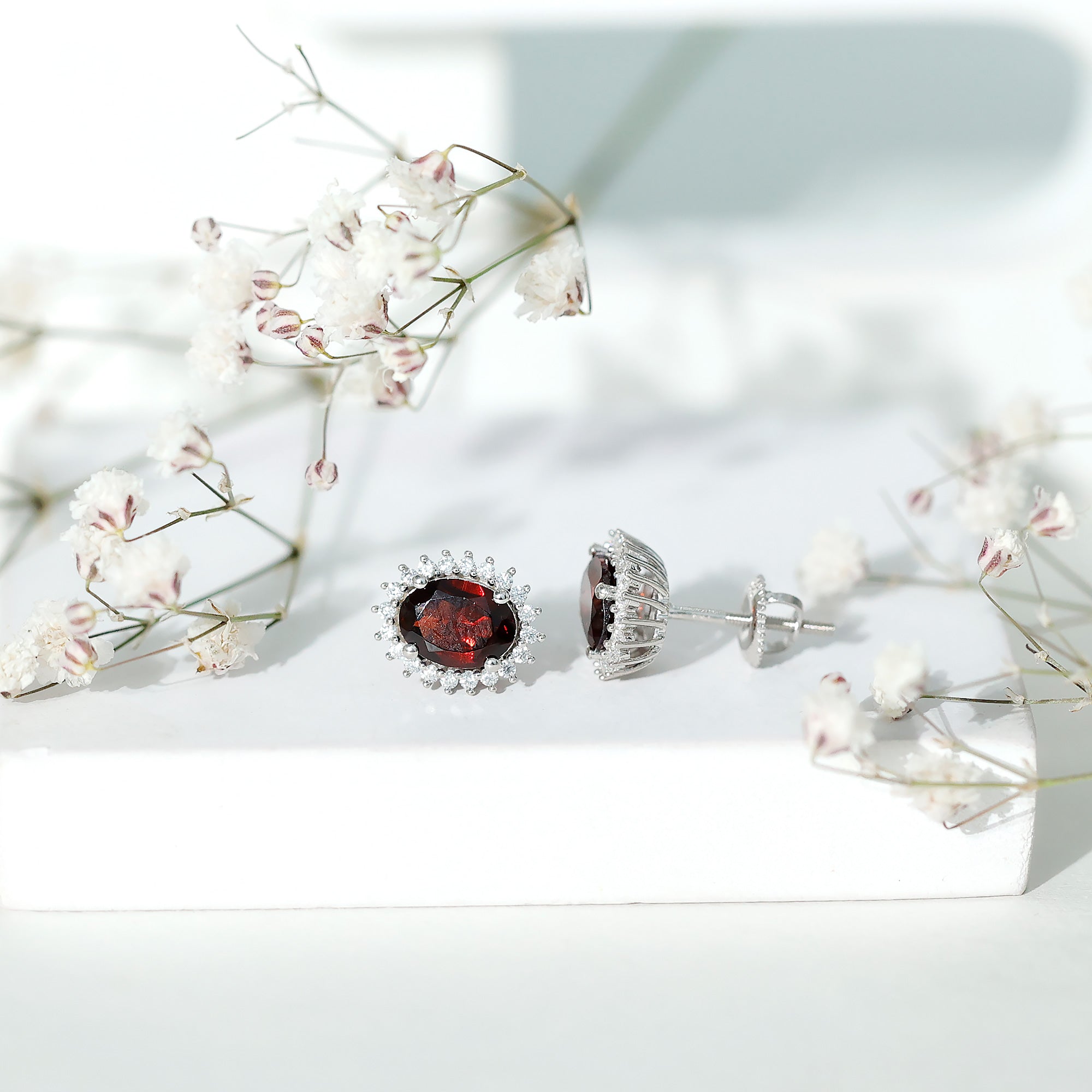 The deep red hue of the garnet gemstone symbolizes passion and love, making these exquisite Garnet and Moissanite Earrings an ideal gift to celebrate a loved ones anniversary. Crafted from 14k white gold plated silver, the design features a stud style that secures with a simple screw back closure for maximum comfort. It showcases a stunning 6X8 MM oval cut garnet encircled by a halo of delicate, sparkling round brilliant-cut moissanite stones. Each of these beautiful garnet stones has been selected for its natural allure and AAA quality, perfectly complementing the brilliance of the D color VS1 clarity Moissanite stones. These Halo Stud Earrings make a perfect Valentines Day gift for girlfriend, 1st anniversary gift for wife, birthday gift for her, and graduation gift for women. These gorgeous January Birthstone Earrings are presented in a velvet pouch and come with a certificate of authenticity.