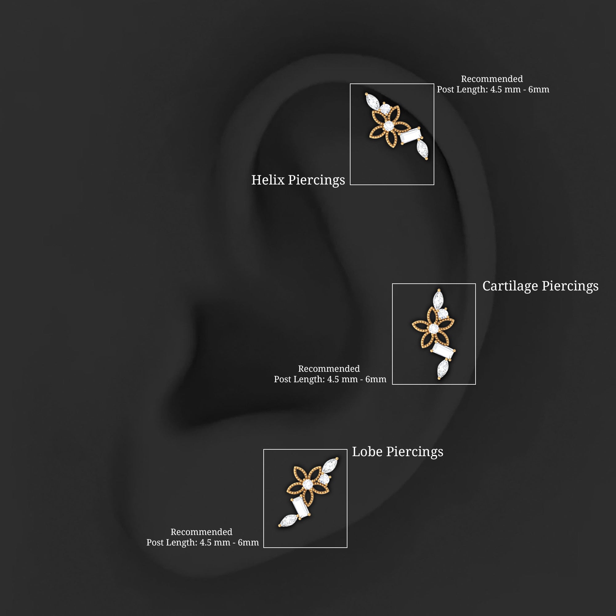 - You can wear this diamond climber earring on your helix, cartilage, or upper lobe piercing. The flat back closure will keep it secured in place.