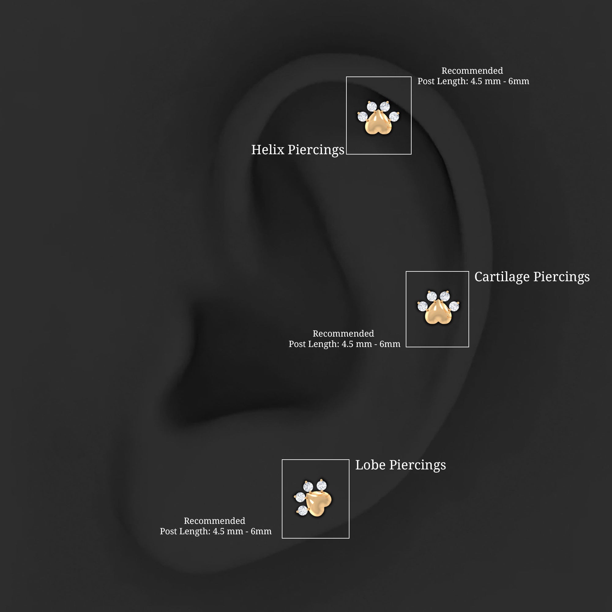 If youre a fan of unique and distinctive Ear Jewelry, our Heart Paw Earring is a must-have for your collection. Designed in a heart shape, expertly crafted with Gold, and embellished with a sparkling Round Cut Moissanites, giving it a stunning and eye-catching look. The alluring gold design of this Paw Earring makes it the perfect accessory to enhance your style, whether you wear it on your Helix, Cartilage, or Conch Piercing.