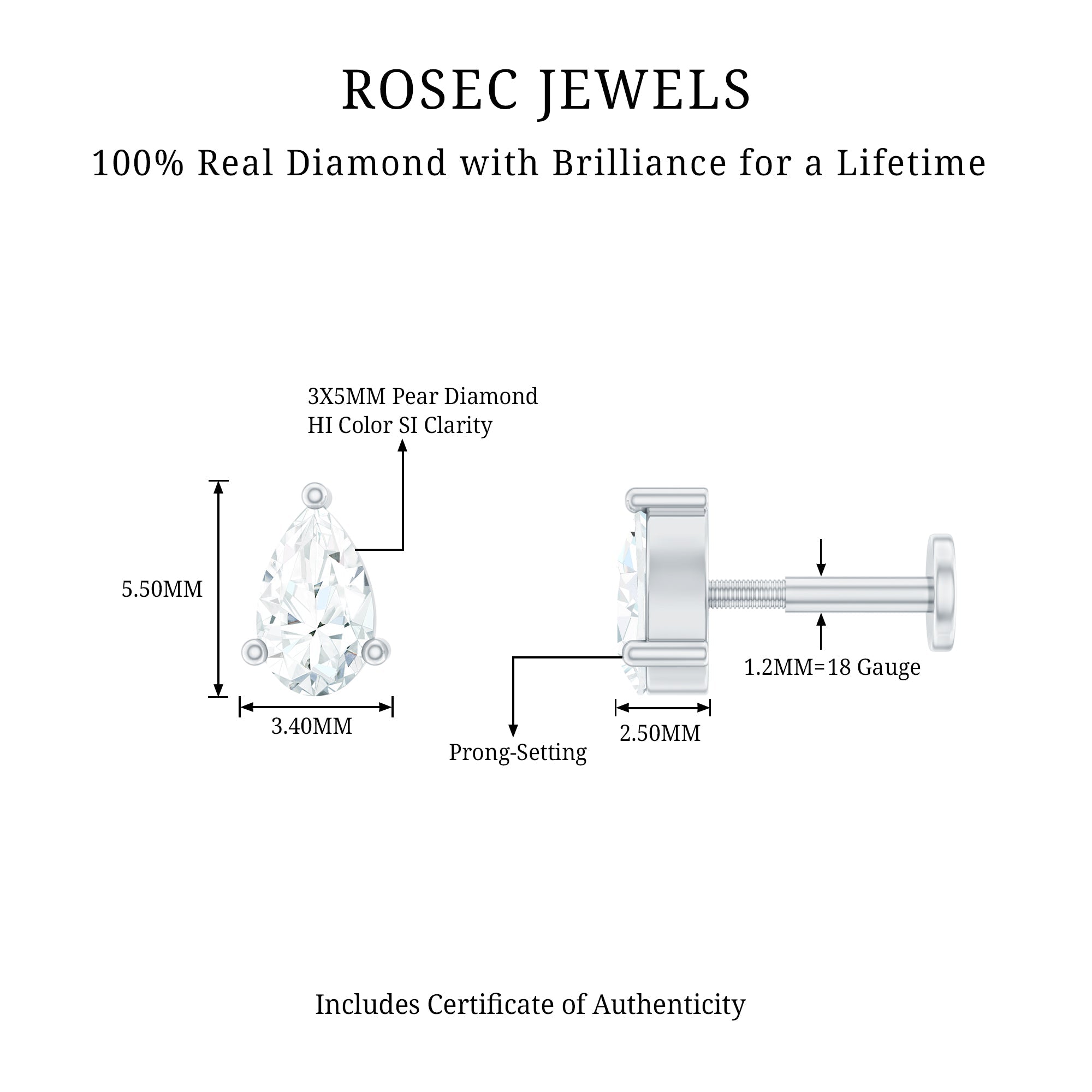 Solitaire Pear Shape Diamond Earring for Tragus Piercing ‐ Natural - ( HI-SI ) / 18K White Gold / Flat Back 5.5 MM