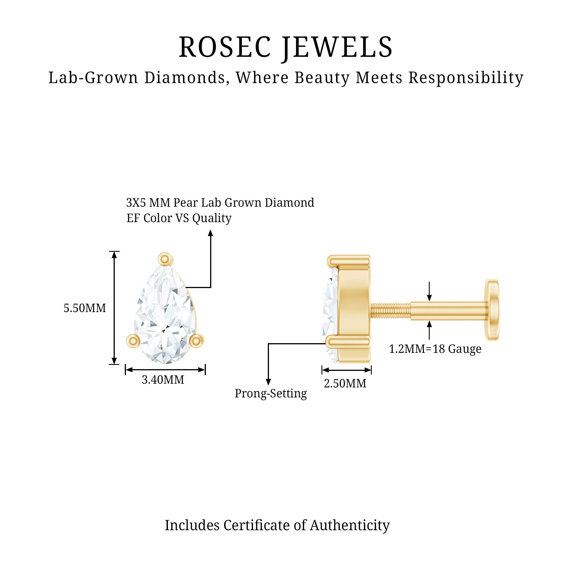 Solitaire Pear Shape Diamond Earring for Tragus Piercing ‐ Lab - ( EF-VS ) / 14K Yellow Gold / Flat Back 5.5 MM